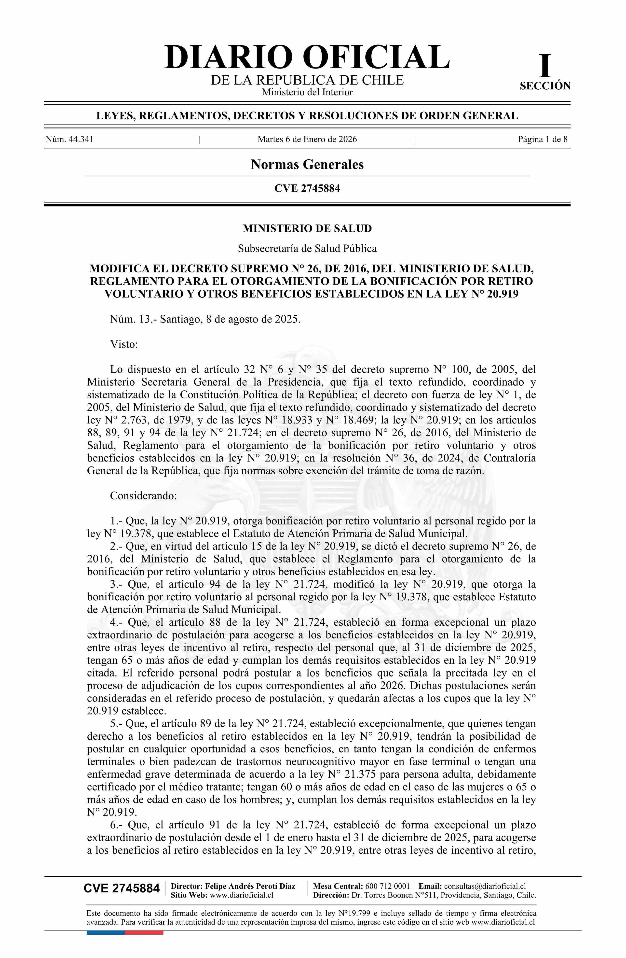 | Título: | Decreto número 13, de 2025.- Modifica decreto N° 26, de 2016, Reglamento para el otorgamiento de la bonificación por retiro voluntario y otros beneficios establecidos en la ley N° 20.919 |