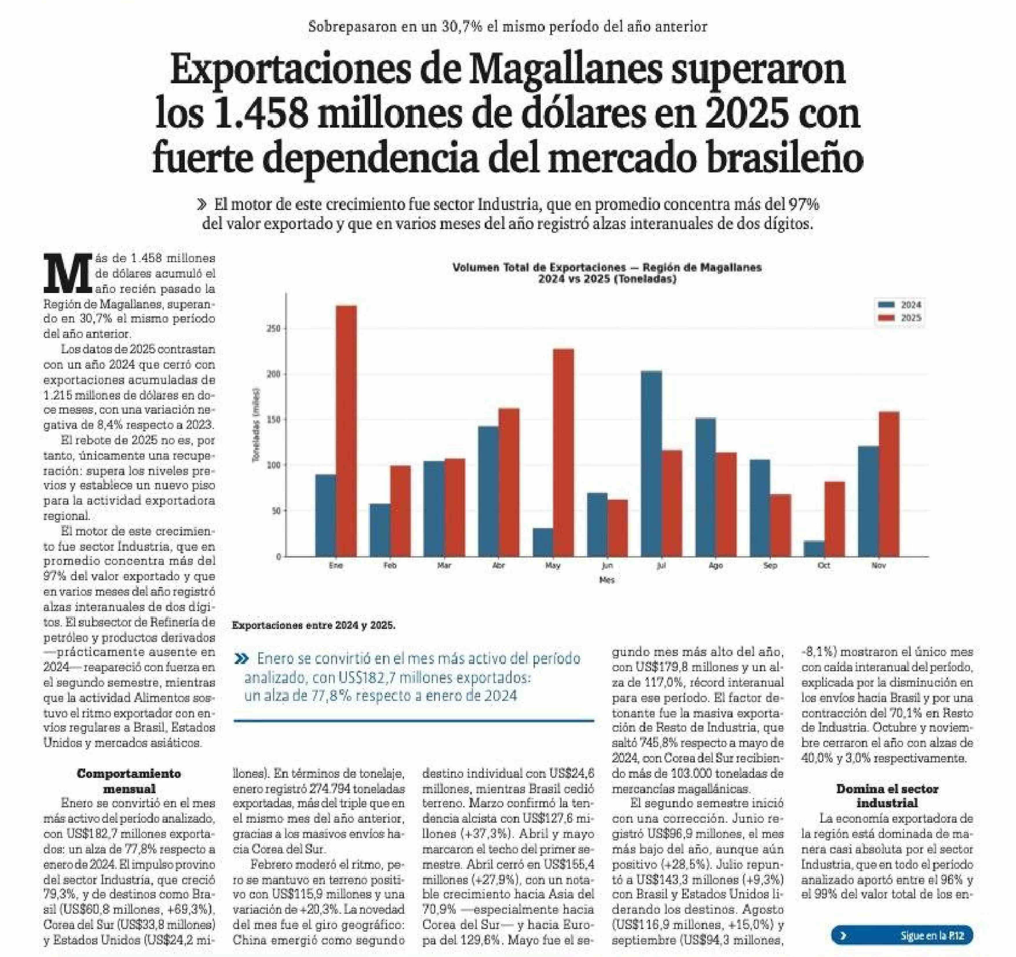 | Título: | Exportaciones de Magallanes superaron los 1.458 millones de dólares en 2025 con fuerte dependencia del mercado brasileño |