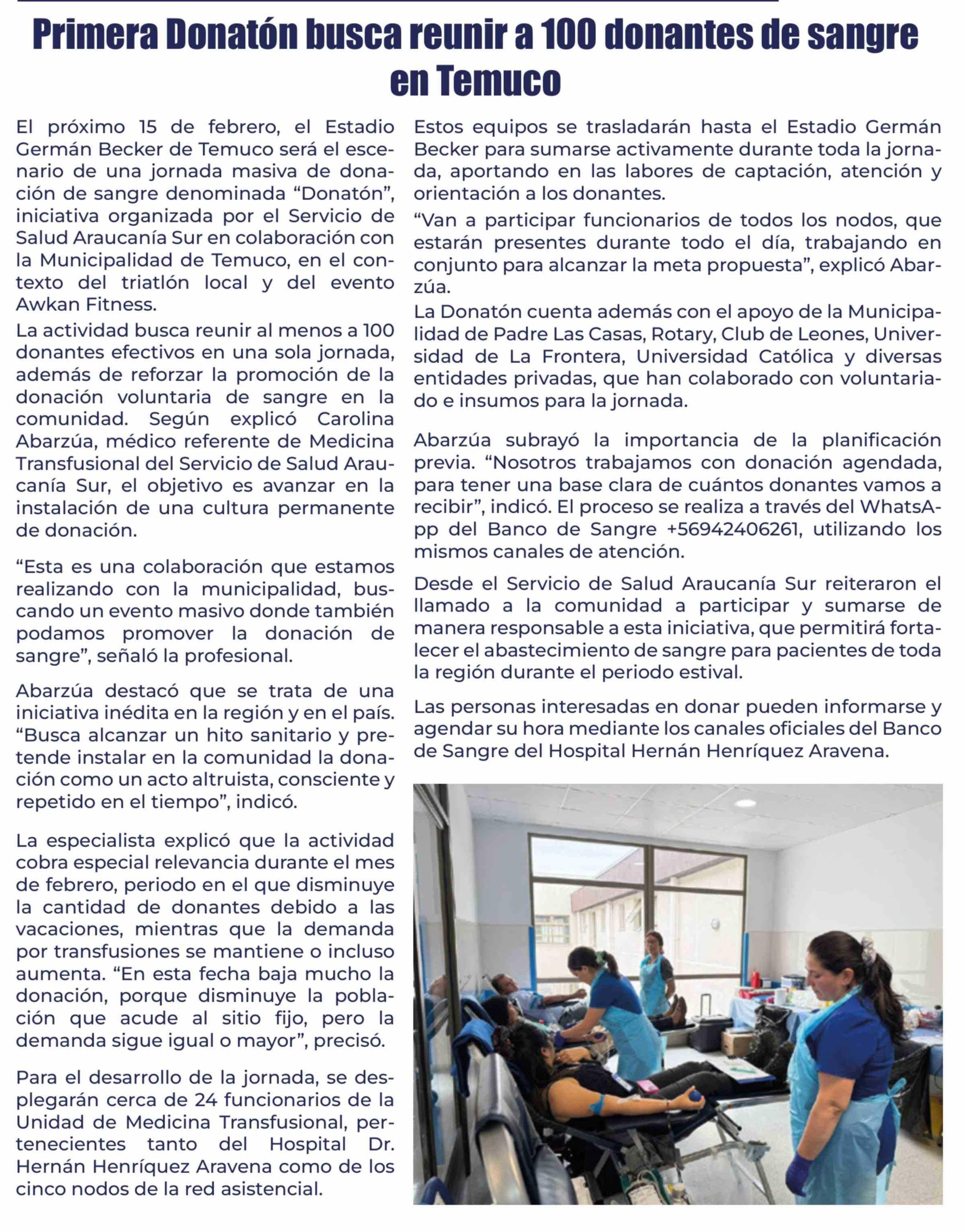 Primera Donatón busca reunir a 100 donantes de sangre en Temuco