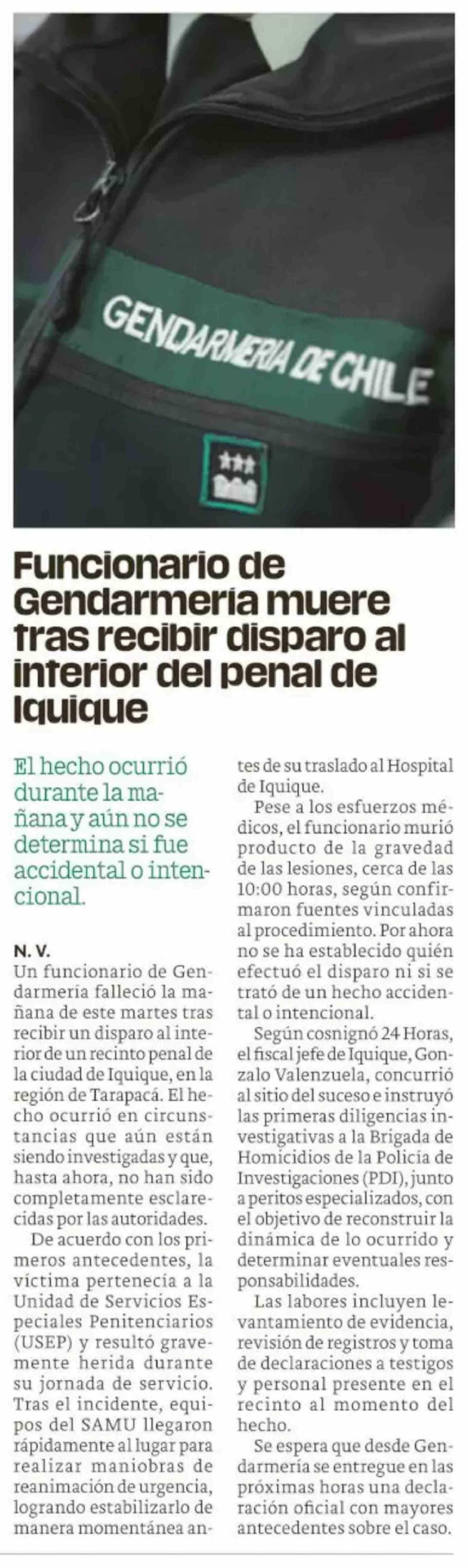 Funcionario de Gendarmeria muere tras recibir disparo al interior del penal de Iquique