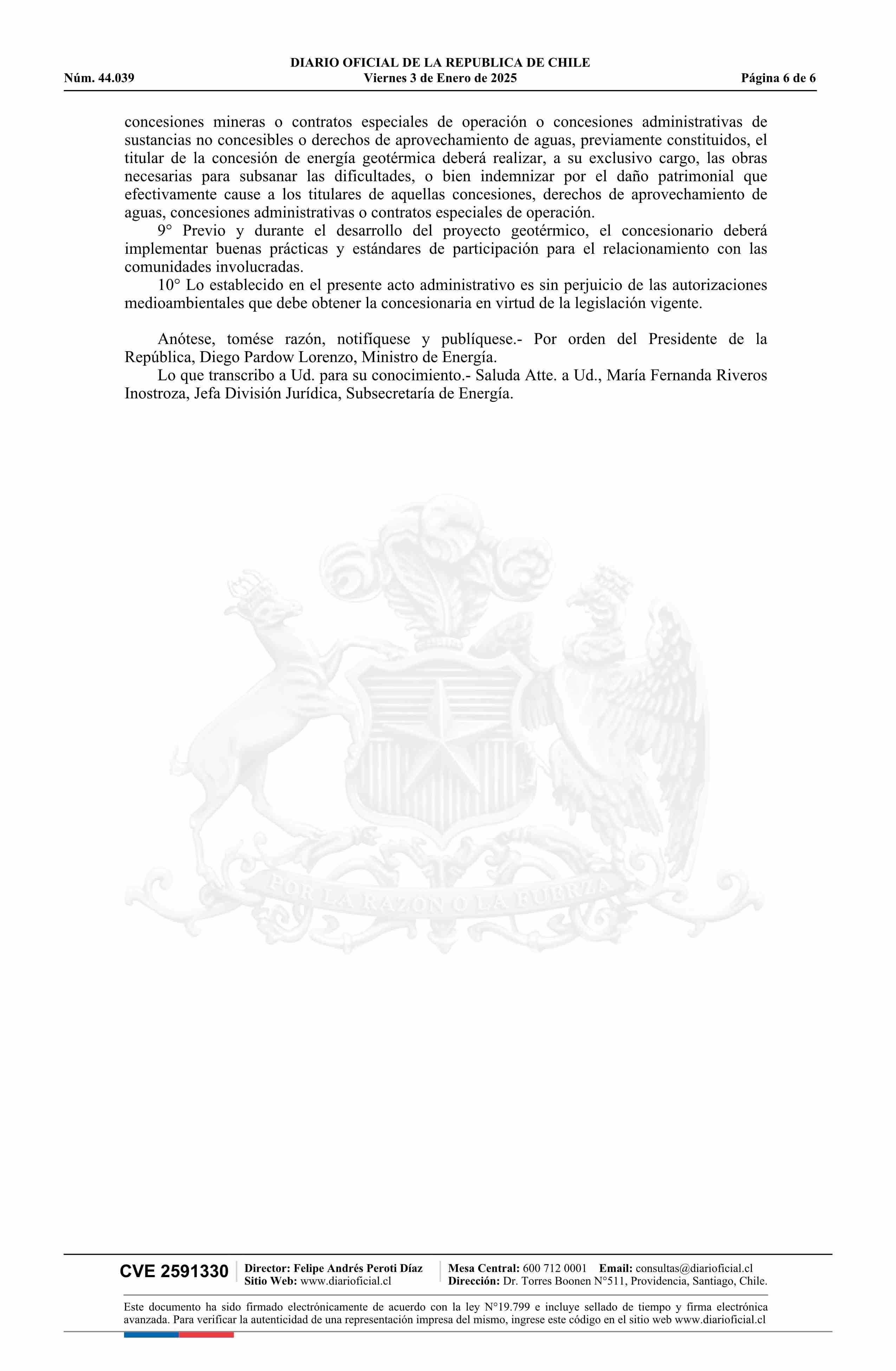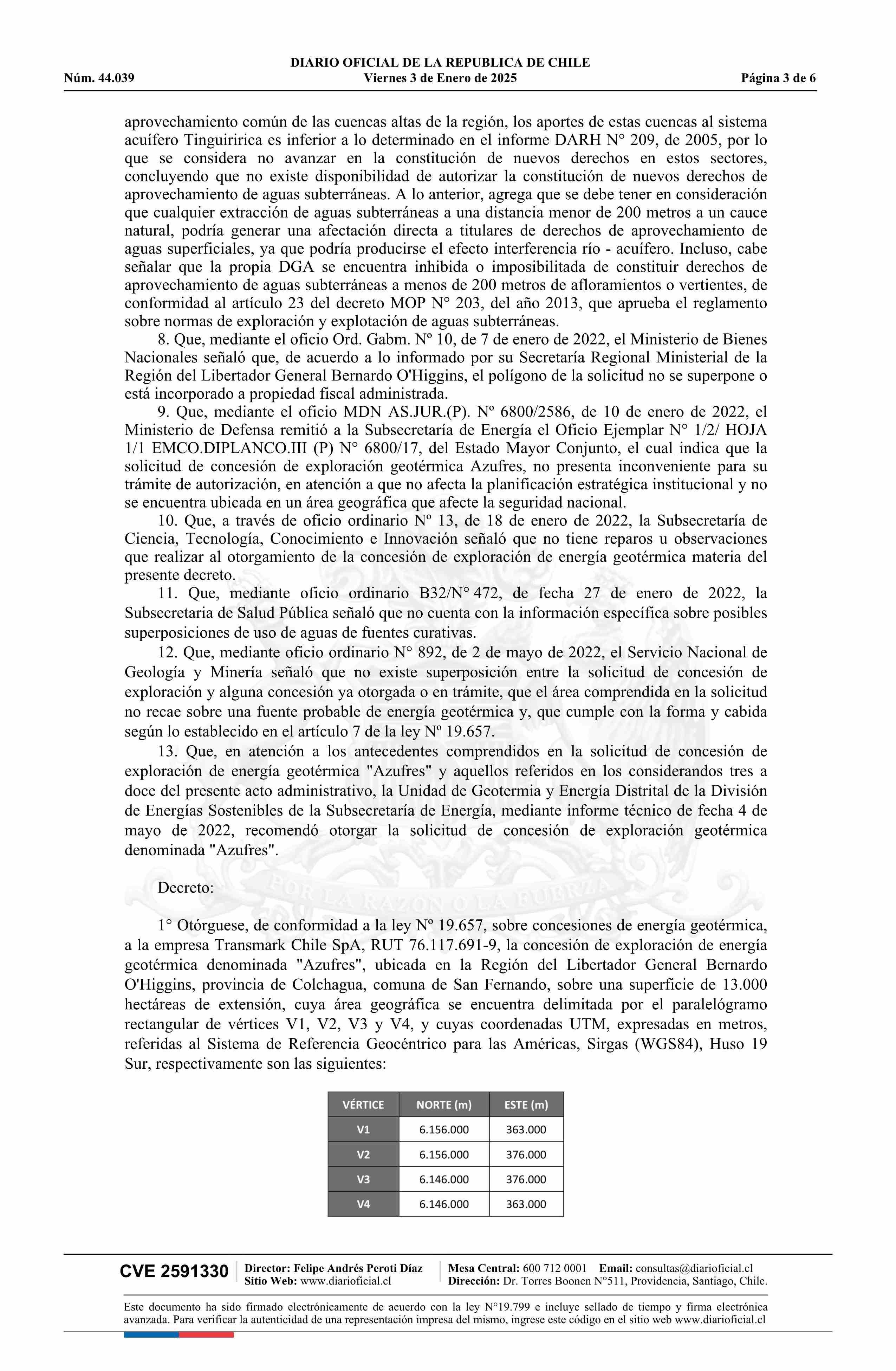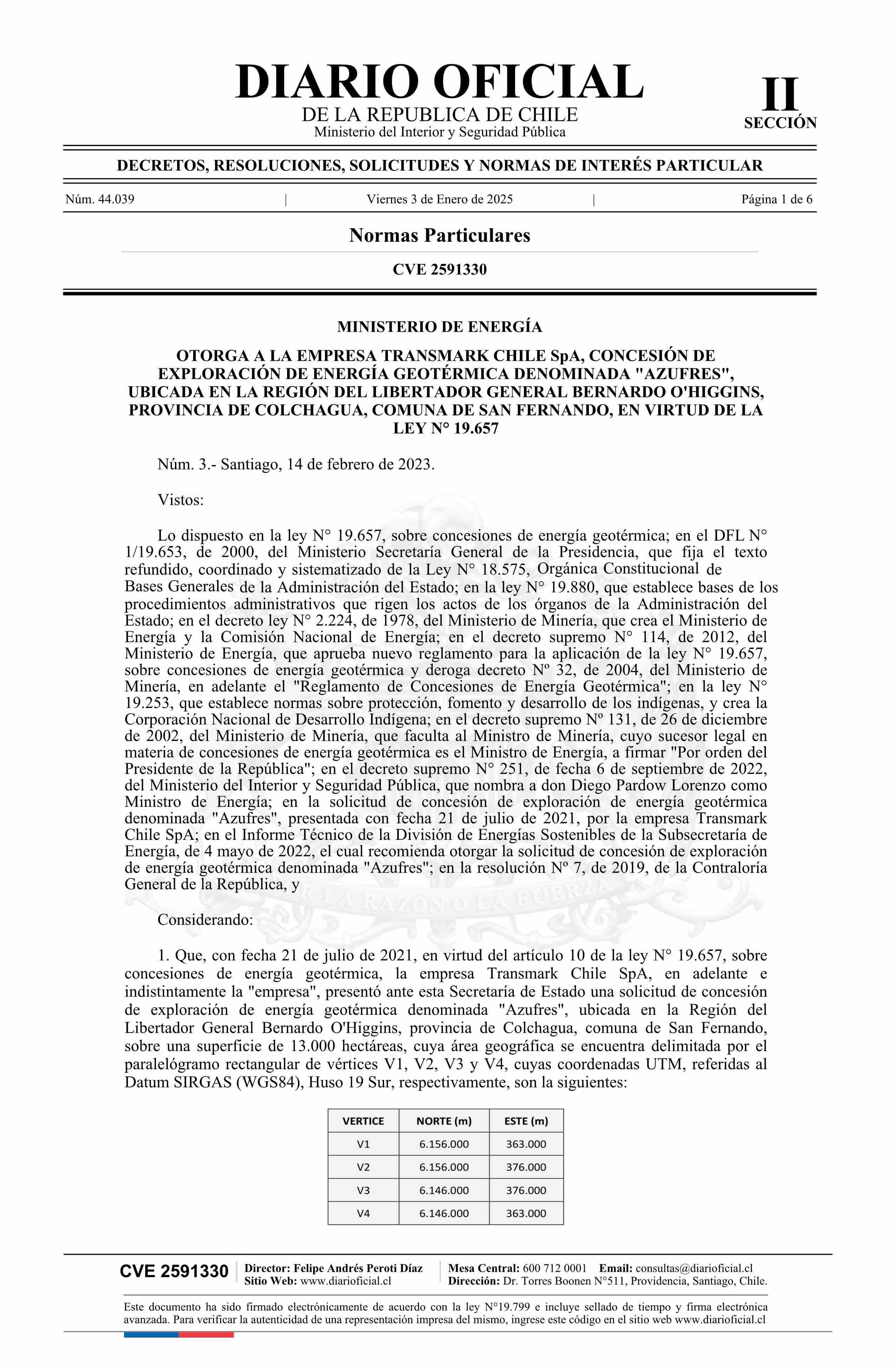 | Título: | Decreto número 3, de 2023.- Otorga a la empresa Transmark Chile SpA, concesión de exploración de energía geotérmica denominada Azufres, ubicada en la Región del Libertador General Bernardo O'Higgins, provincia de Colchagua, comuna de San Fernando, en virtud de la ley N° 19.657 |