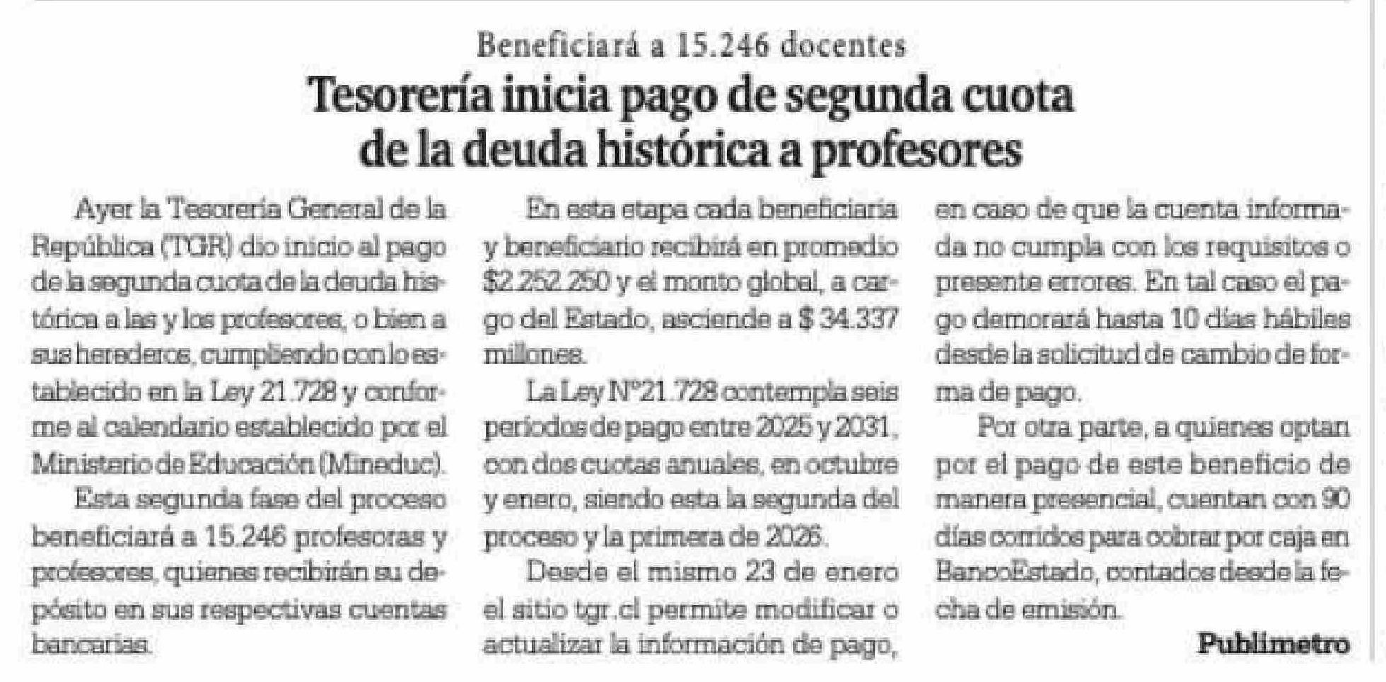 Tesorería inicia pago de segunda cuota de la deuda histórica a profesores