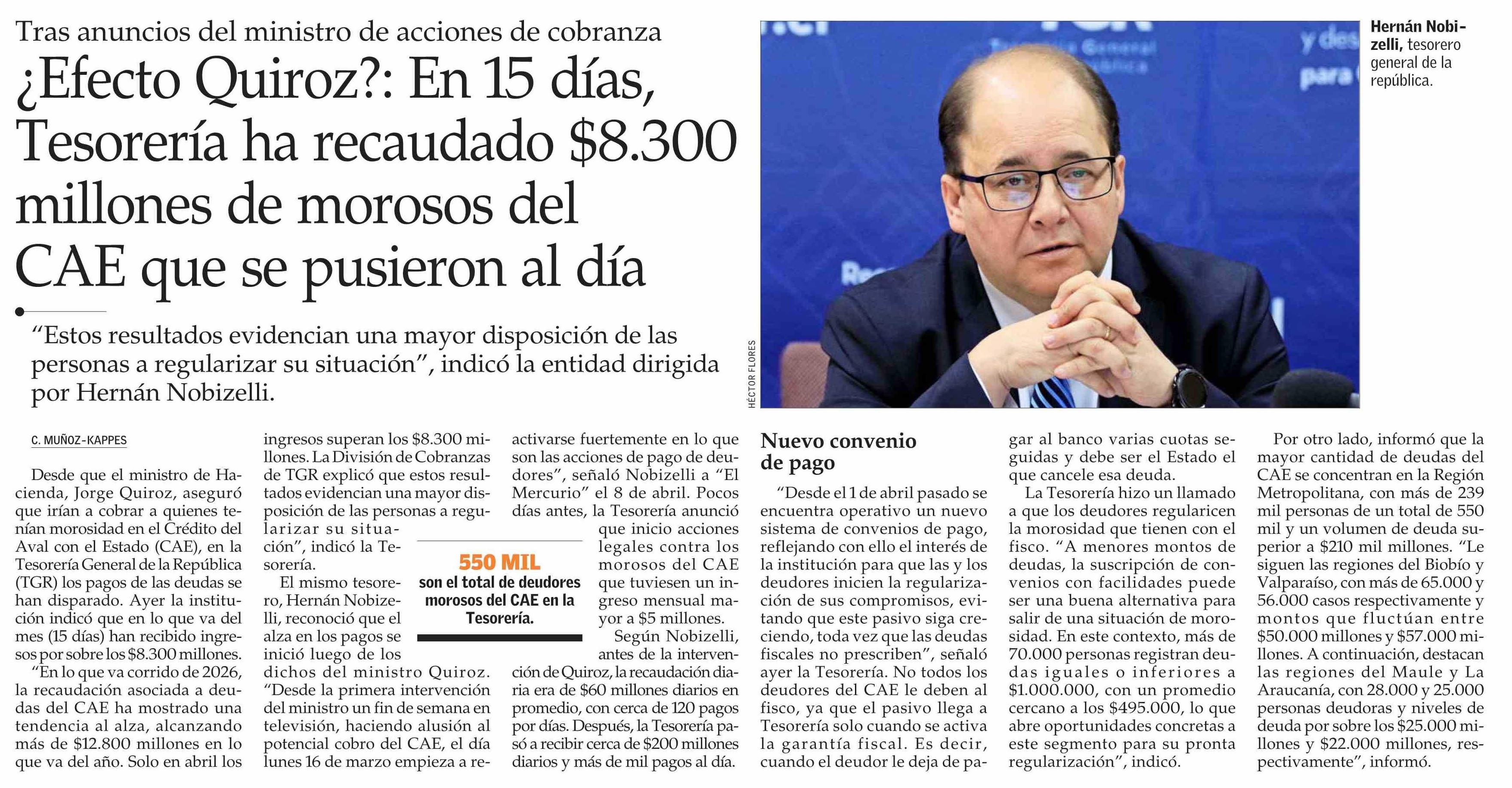 ¿Efecto Quiroz?: En 15 días, Tesorería ha recaudado $8.300 millones de morosos del CAE que se pusieron al día