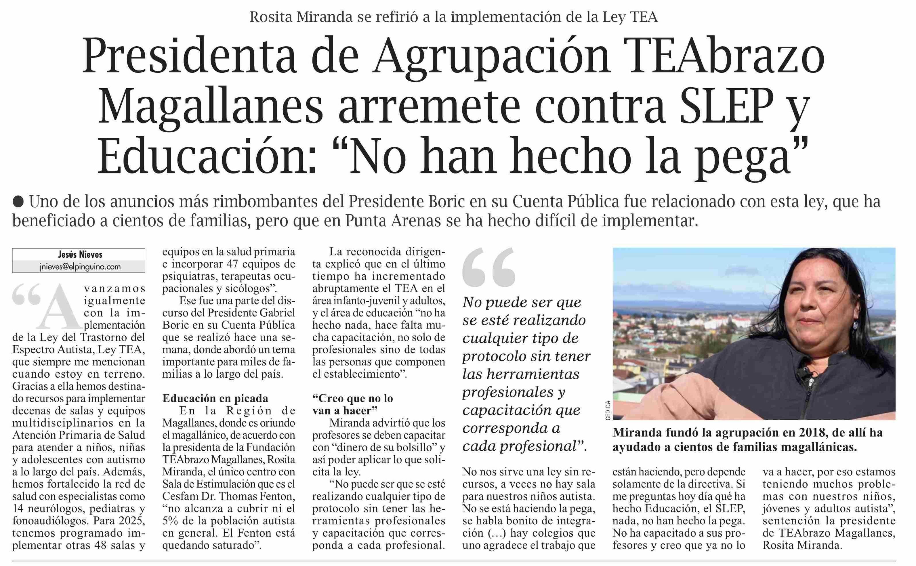 Presidenta de Agrupación TEAbrazo Magallanes arremete contra SLEP y Educación: “No han hecho la pega”