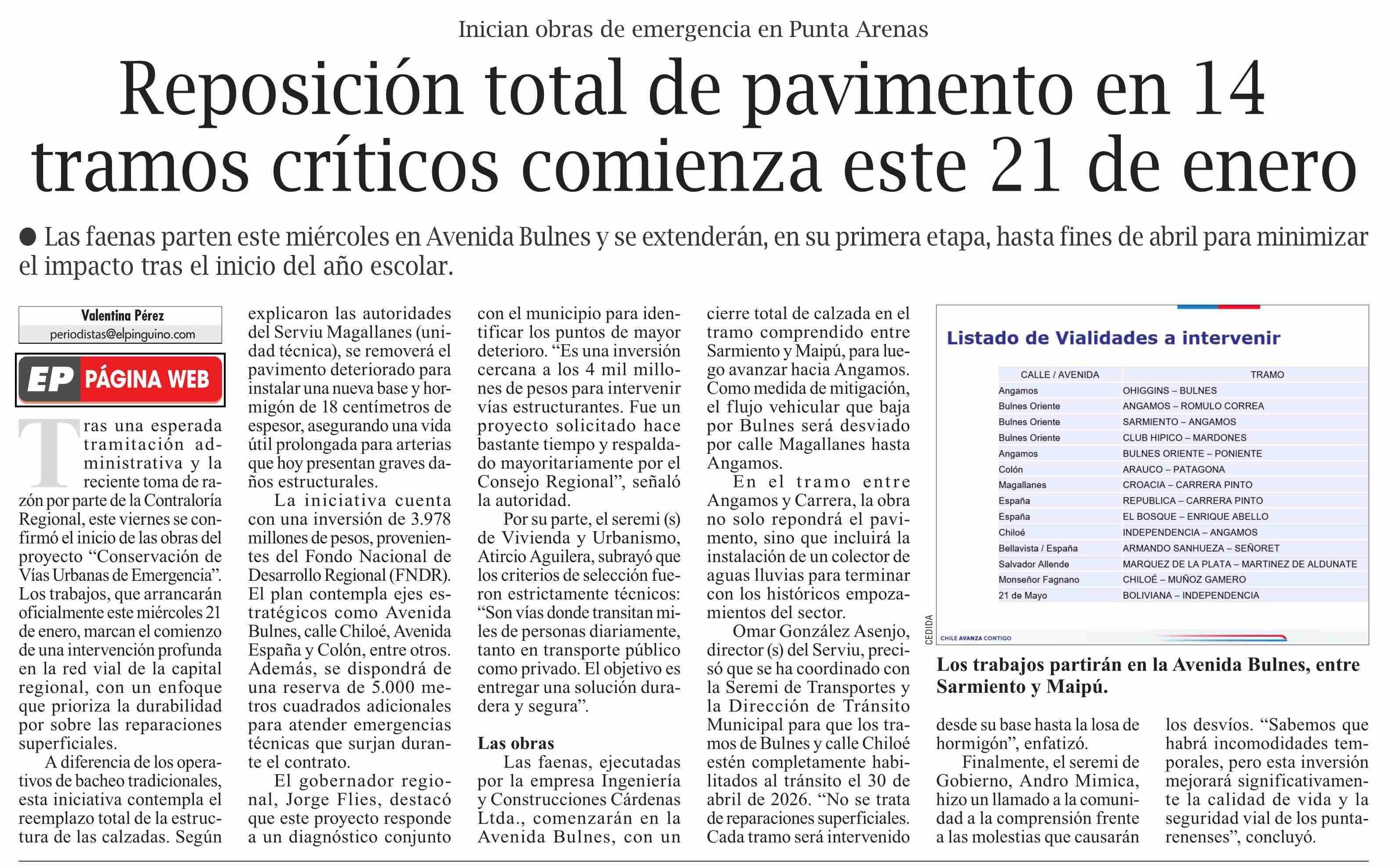 Reposición total de pavimento en 14 tramos críticos comienza este 21 de enero