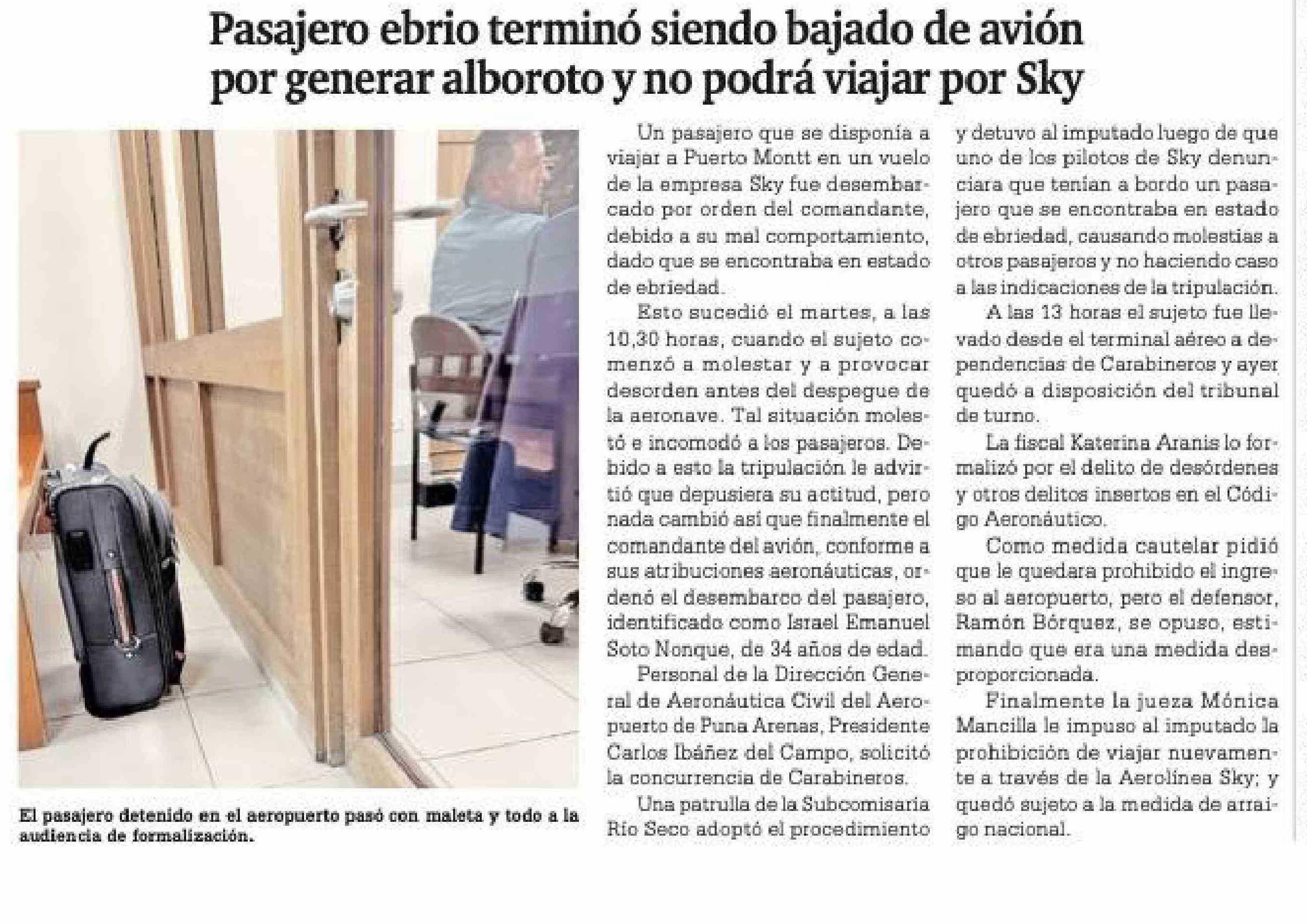 Pasajero ebrio terminó siendo bajado de avión por generar alboroto y no podrá viajar por Sky