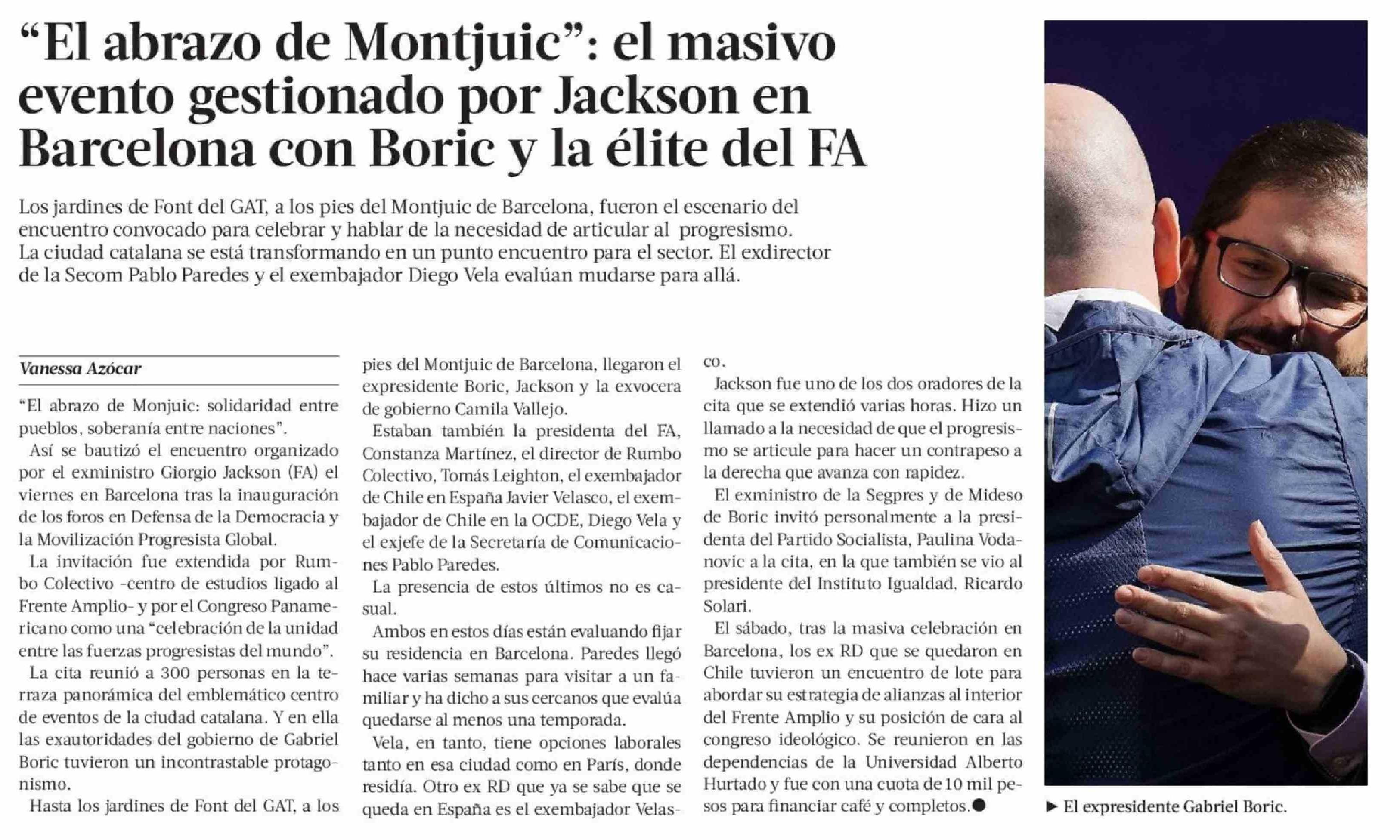 "El abrazo de Montjuic": el masivo evento gestionado por Jackson en Barcelona con Boric y la élite del FA