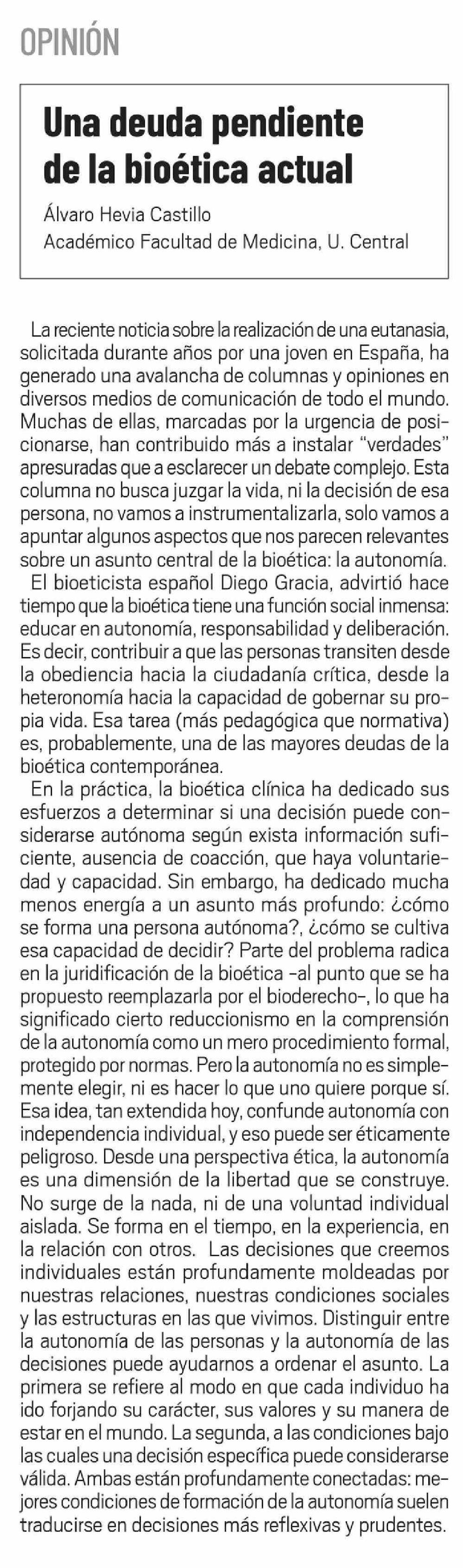 Título: Columnas de Opinión: Una deuda pendiente de la bioética actual