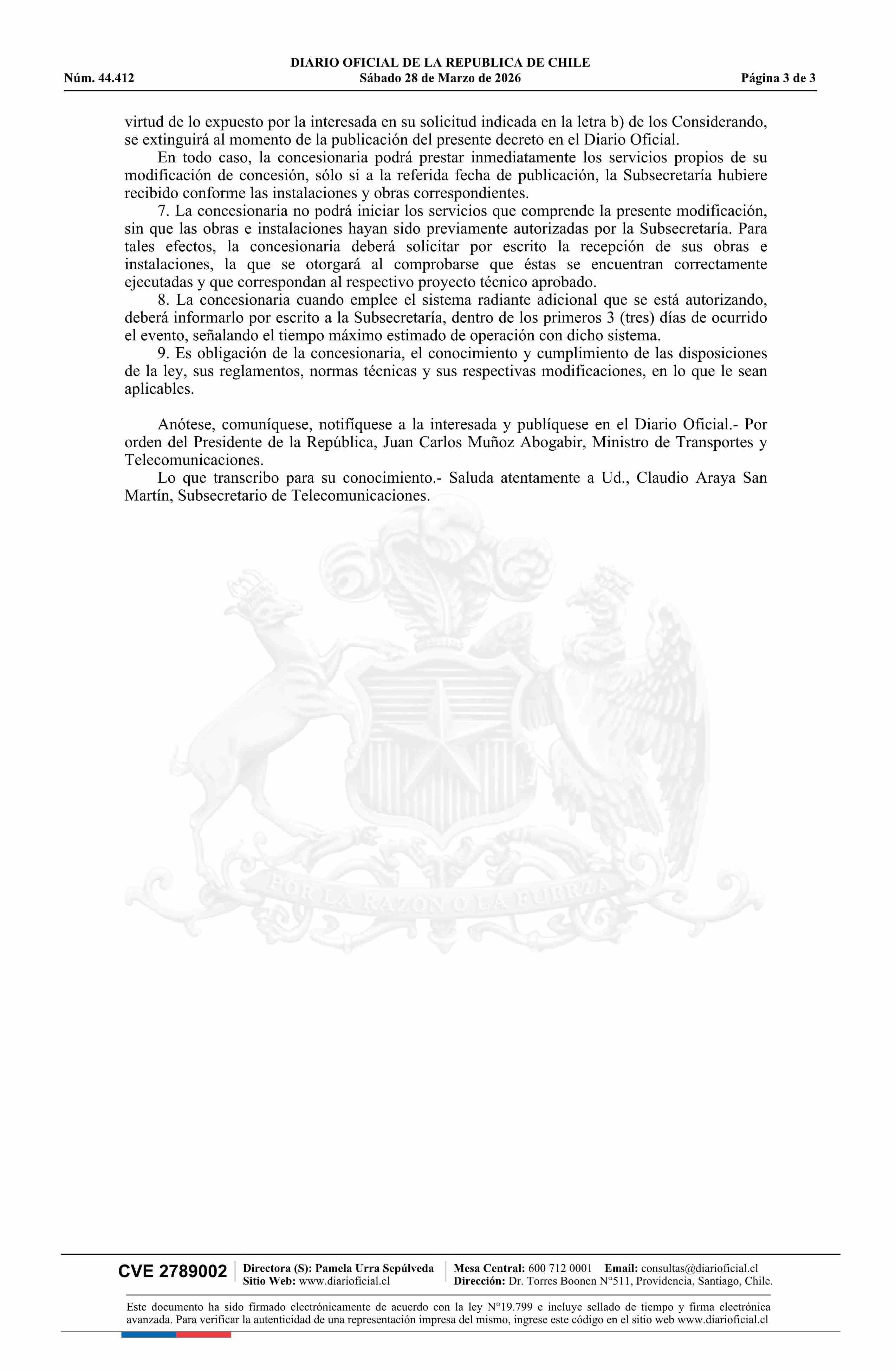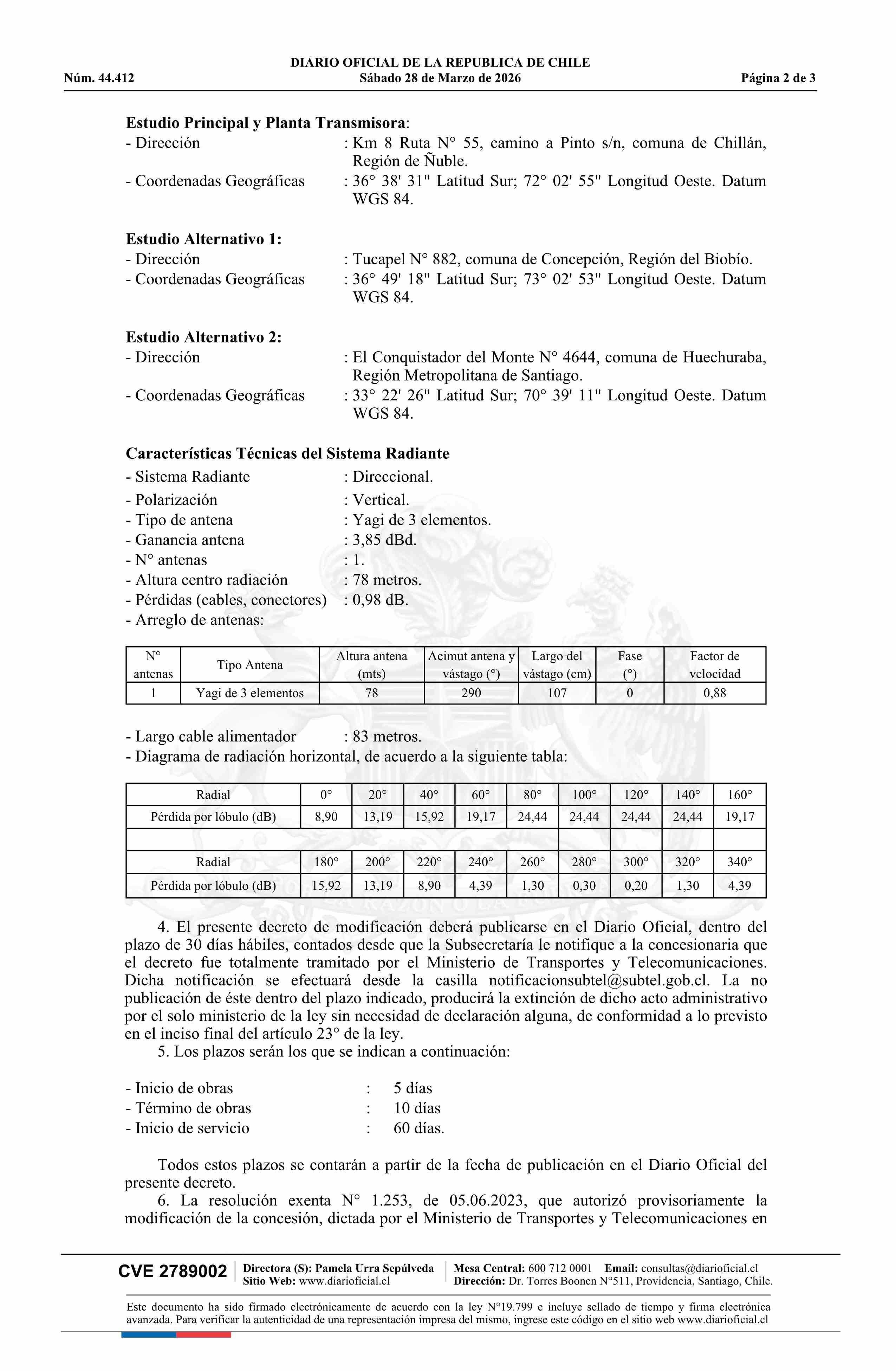 | Título: | Decreto exento número 1.005, de 2025.- Modifica concesión de radiodifusión sonora en frecuencia modulada para la localidad de Chillán |
