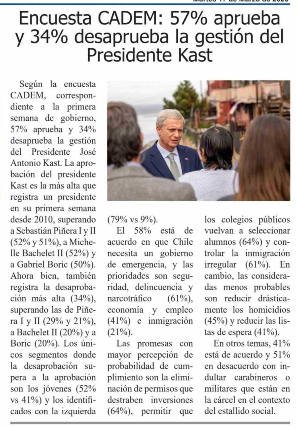 Encuesta CADEM: 57% aprueba y 34% desaprueba la gestión del Presidente Kast