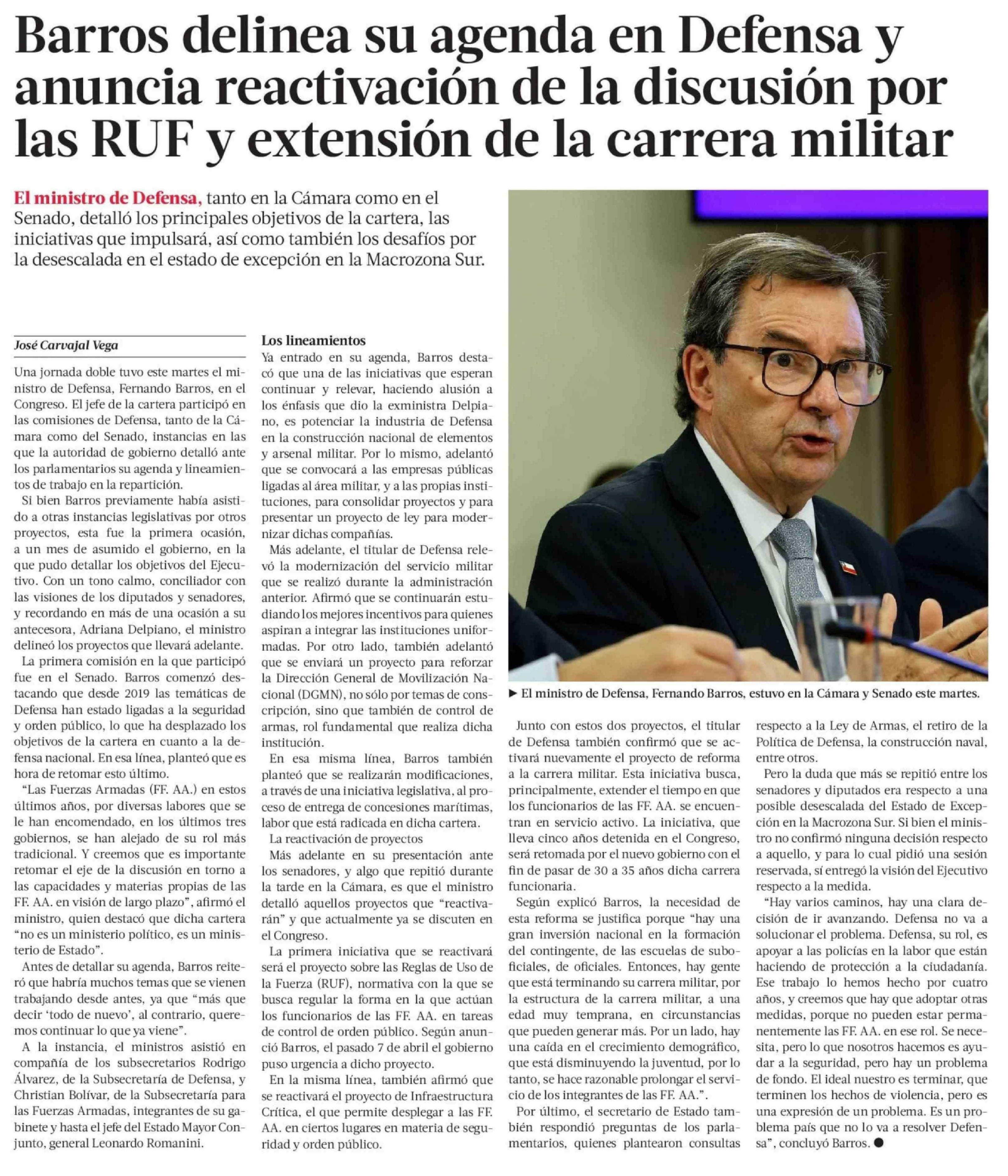 Barros delinea su agenda en Defensa y anuncia reactivación de la discusión por las RUF y extensión de la carrera militar