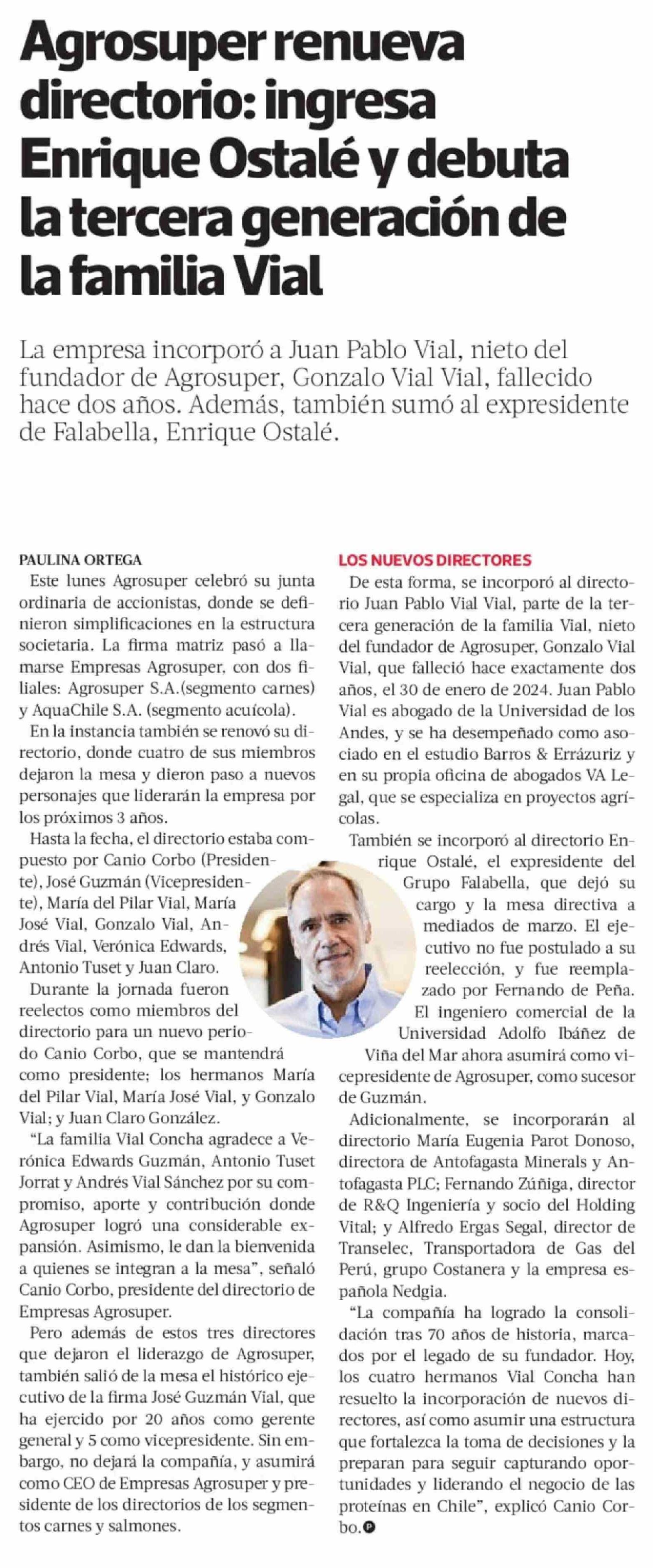 Agrosuper renueva directorio: ingresa Enrique Ostalé y debuta la tercera generación de la familia Vial