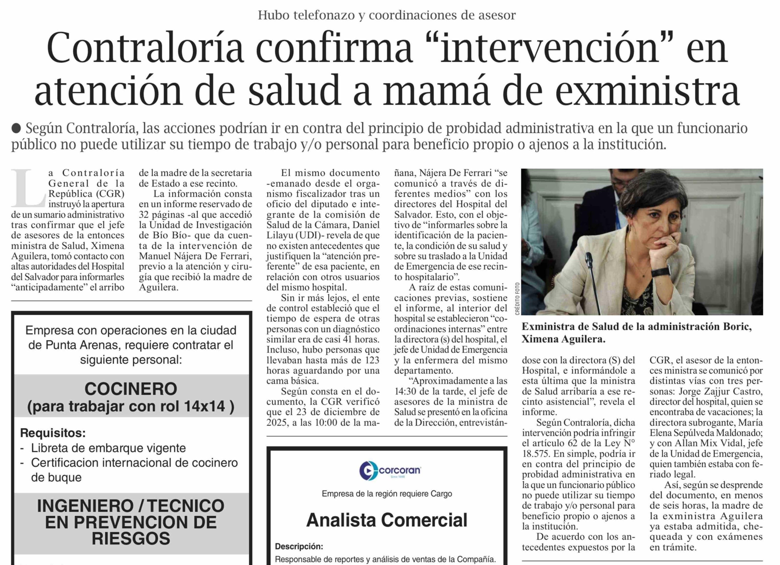 Contraloría confirma "intervención" en atención de salud a mamá de exministra