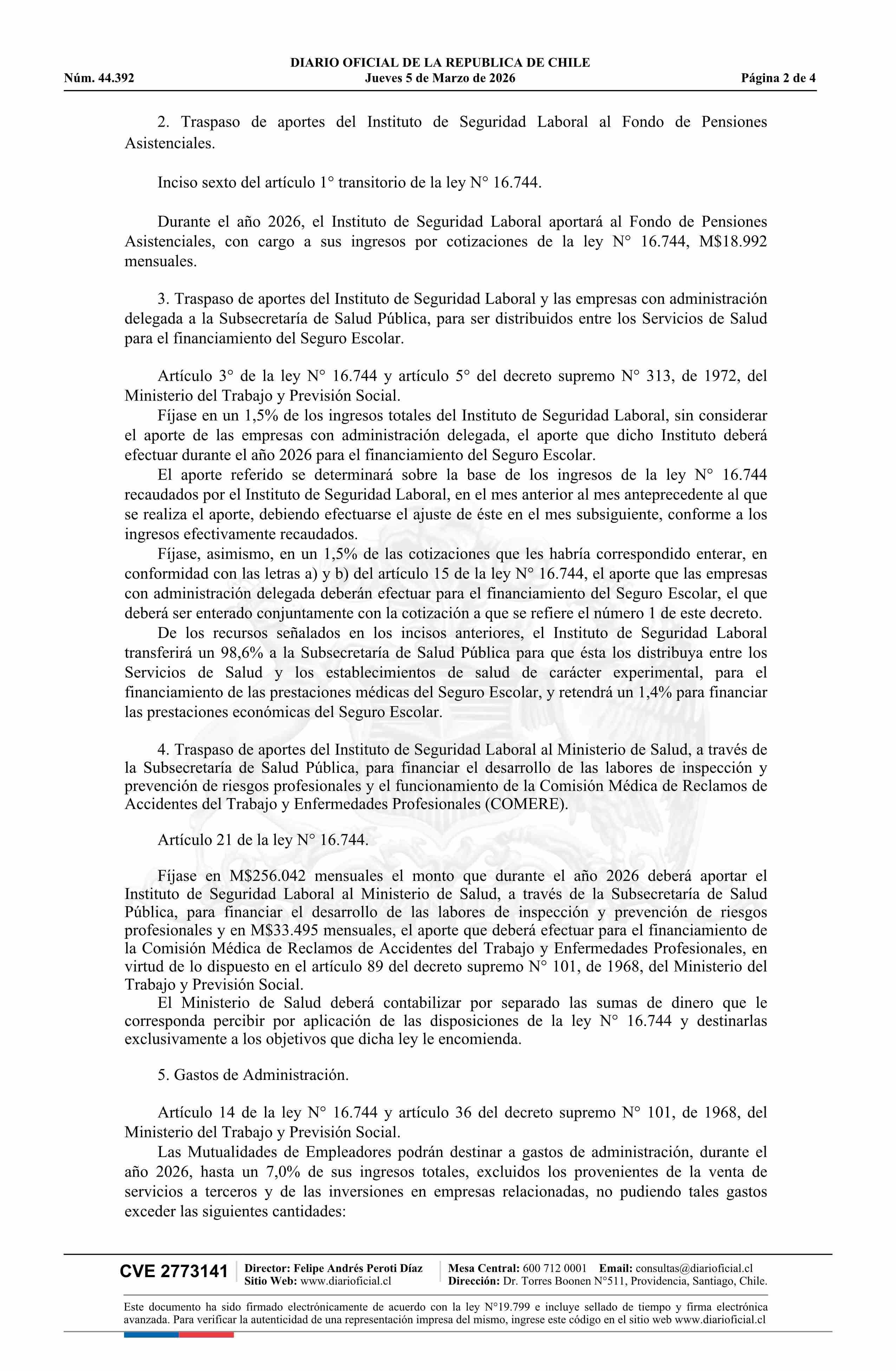 | Título: | Decreto número 72, de 2025.- Establece el presupuesto para la aplicación del seguro social contra riesgos de accidentes del trabajo y enfermedades profesionales para el año 2026 |