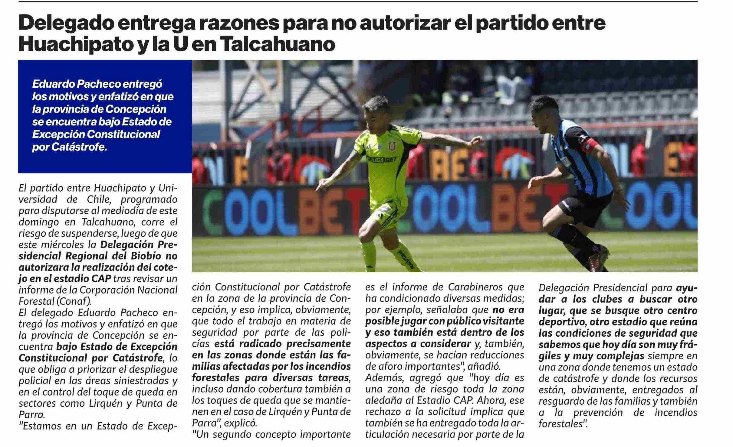 Delegado entrega razones para no autorizar el partido entre Huachipato y la U en Talcahuano — I