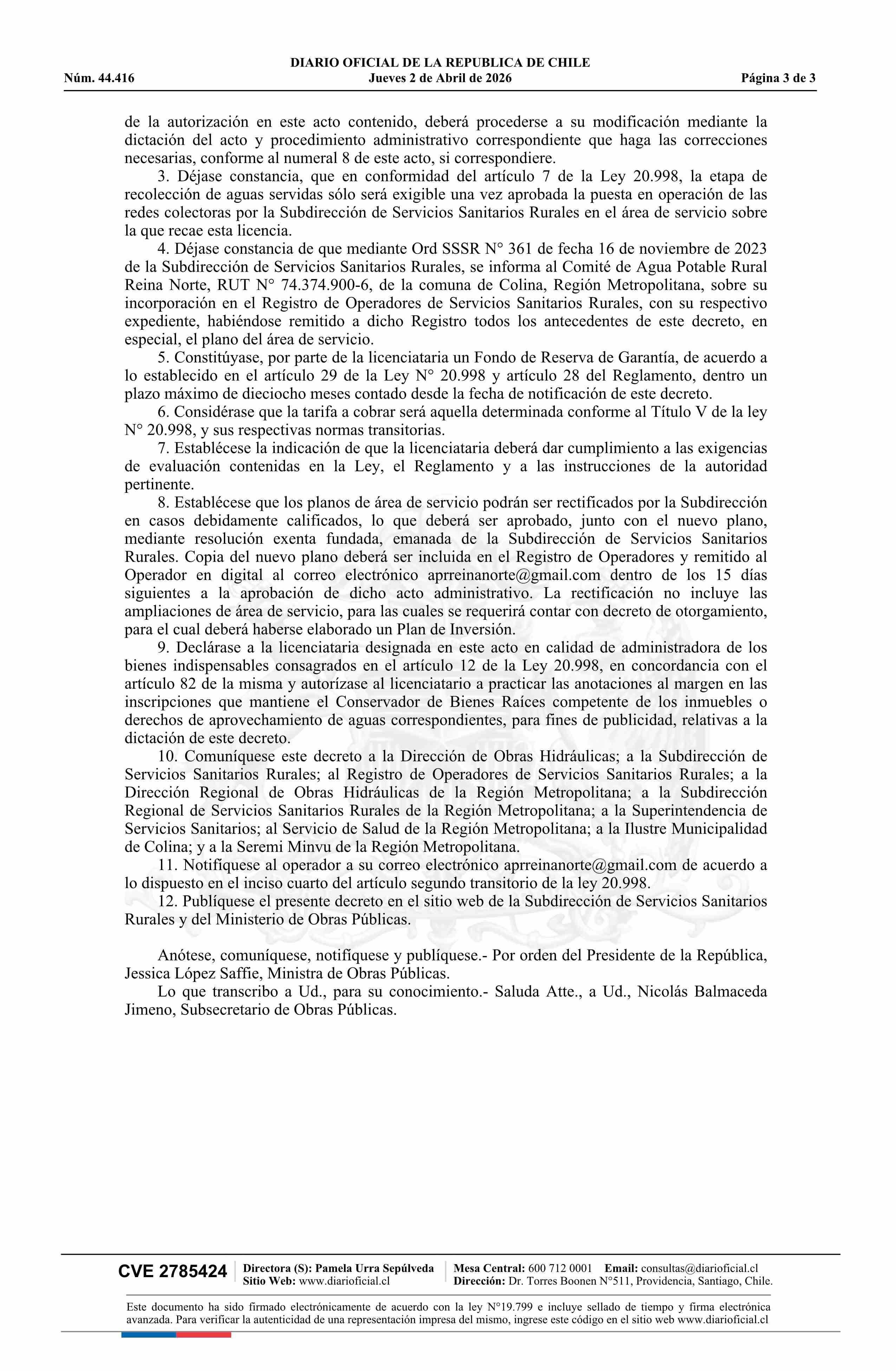 | Título: | Decreto exento número 43, de 2026.- Reconoce Licencia de servicio sanitario rural al Comité de Agua Potable Rural Reina Norte, comuna de Colina, provincia de Chacabuco, Región Metropolitana, y da cuenta de su registro como operador |