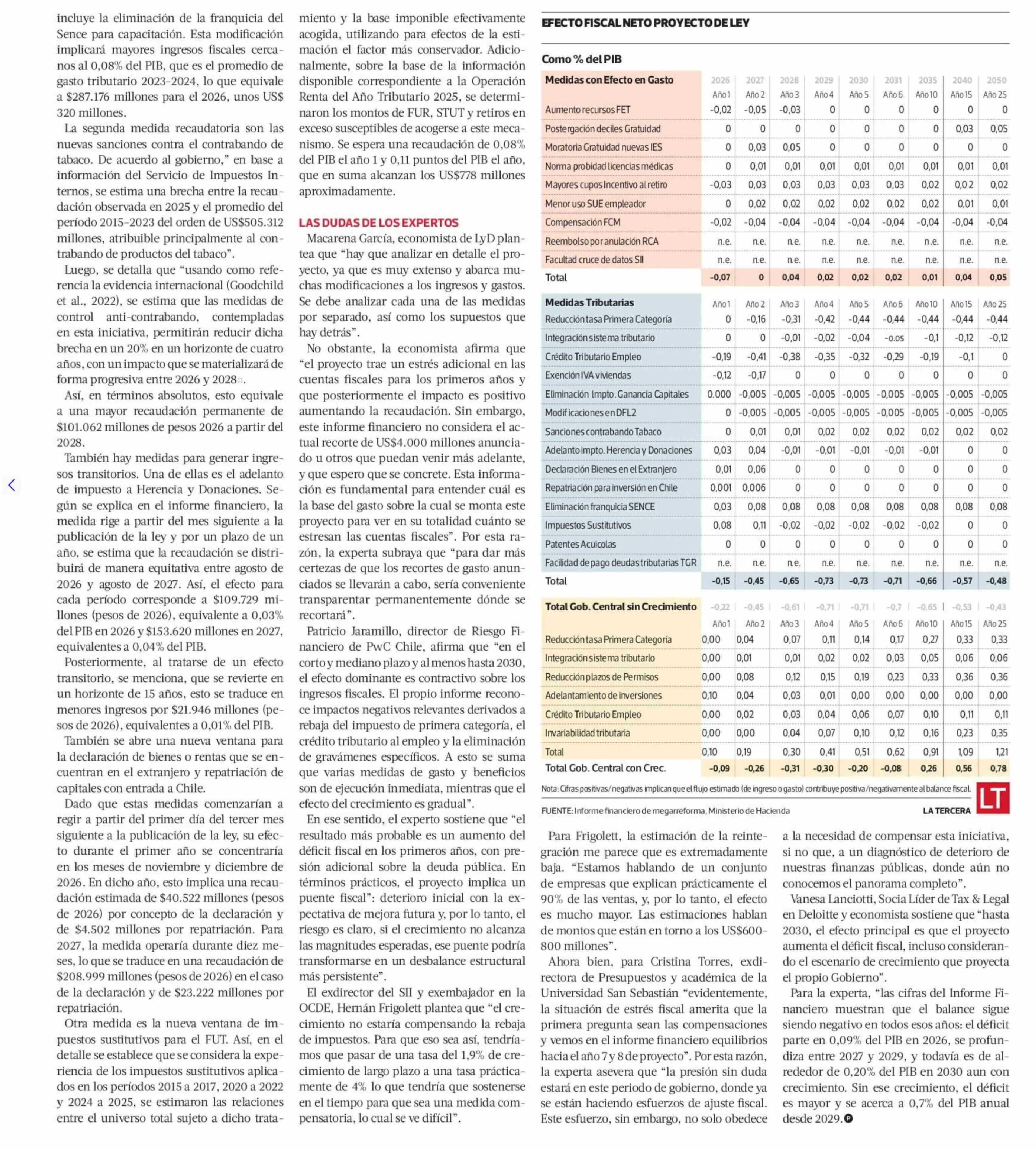 | Título: | Costo fiscal del proyecto alcanza peak de 0,71% del PIB al cuarto año y expertos dudan de compensación por mayor crecimiento económico esperado |