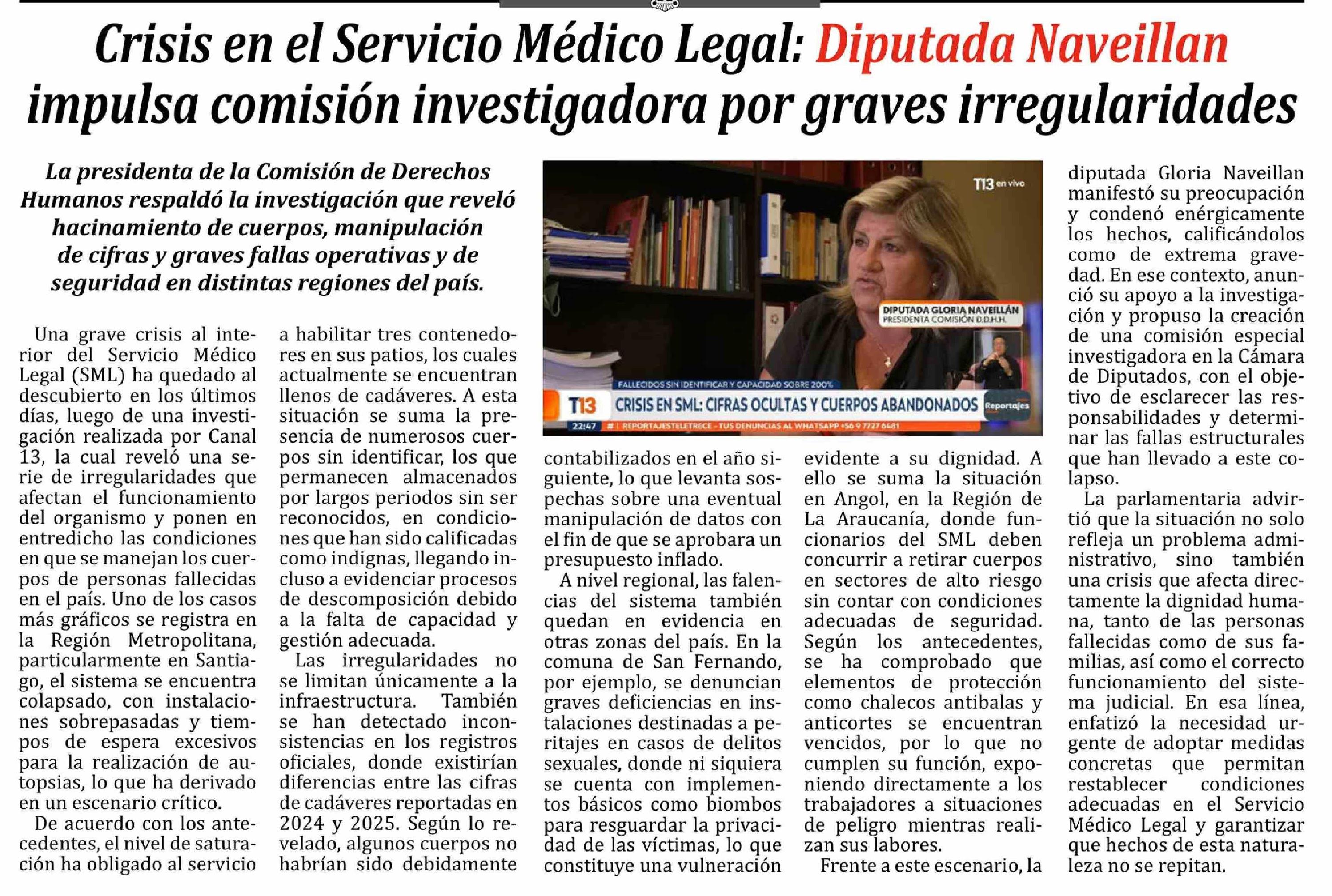 Crisis en el Servicio Médico Legal: Diputada Naveillan impulsa comisión investigadora por graves irregularidades