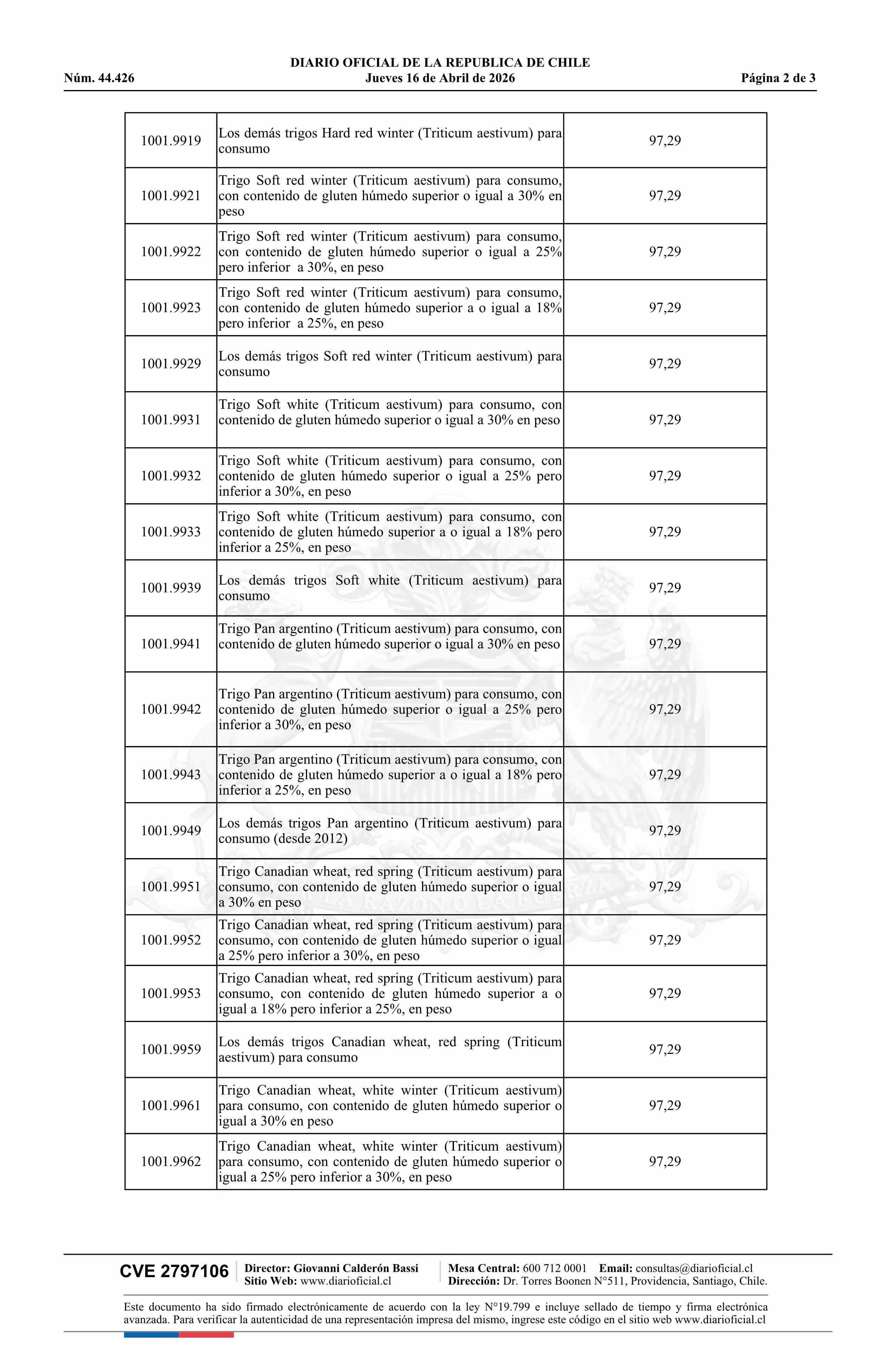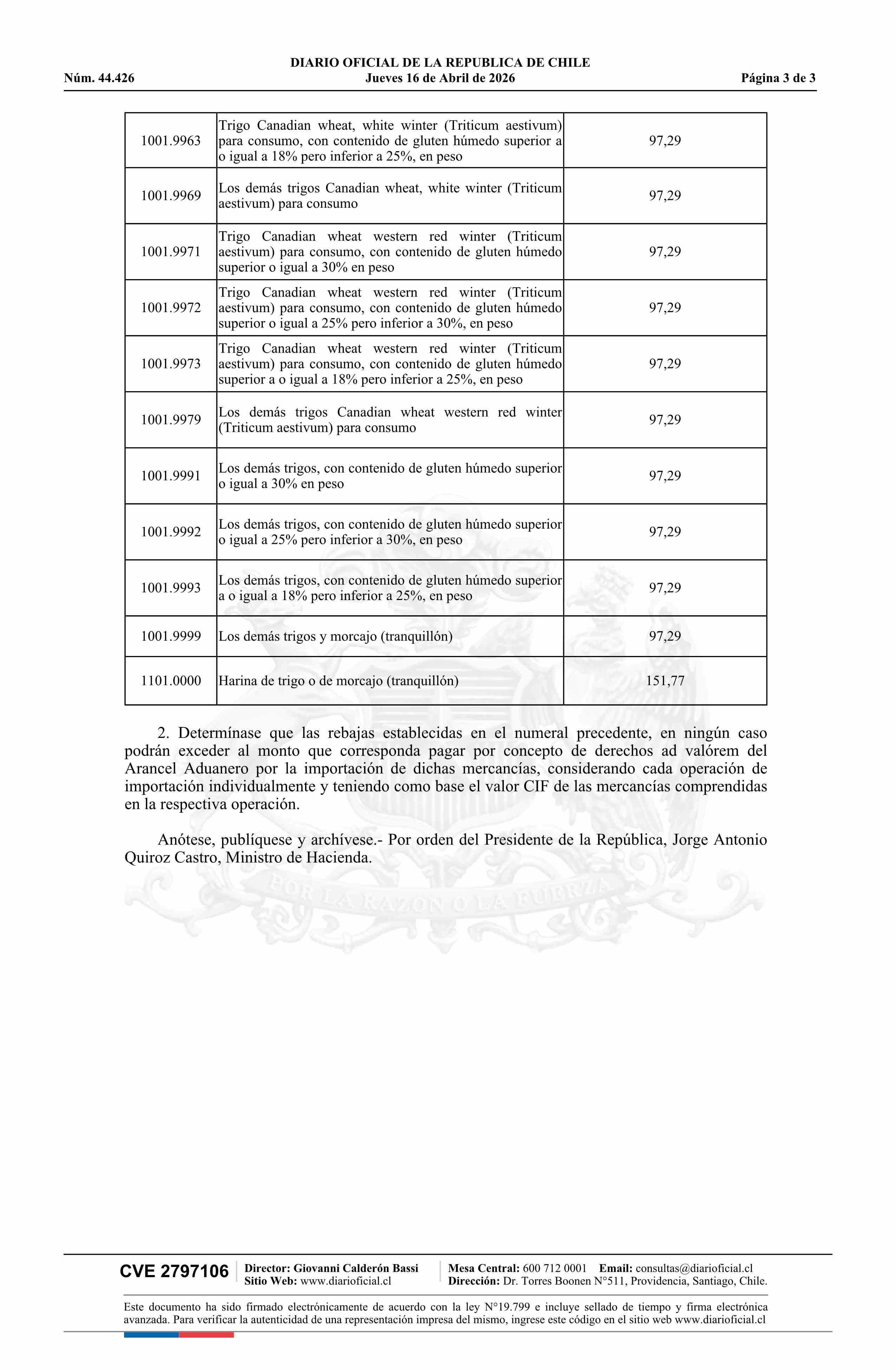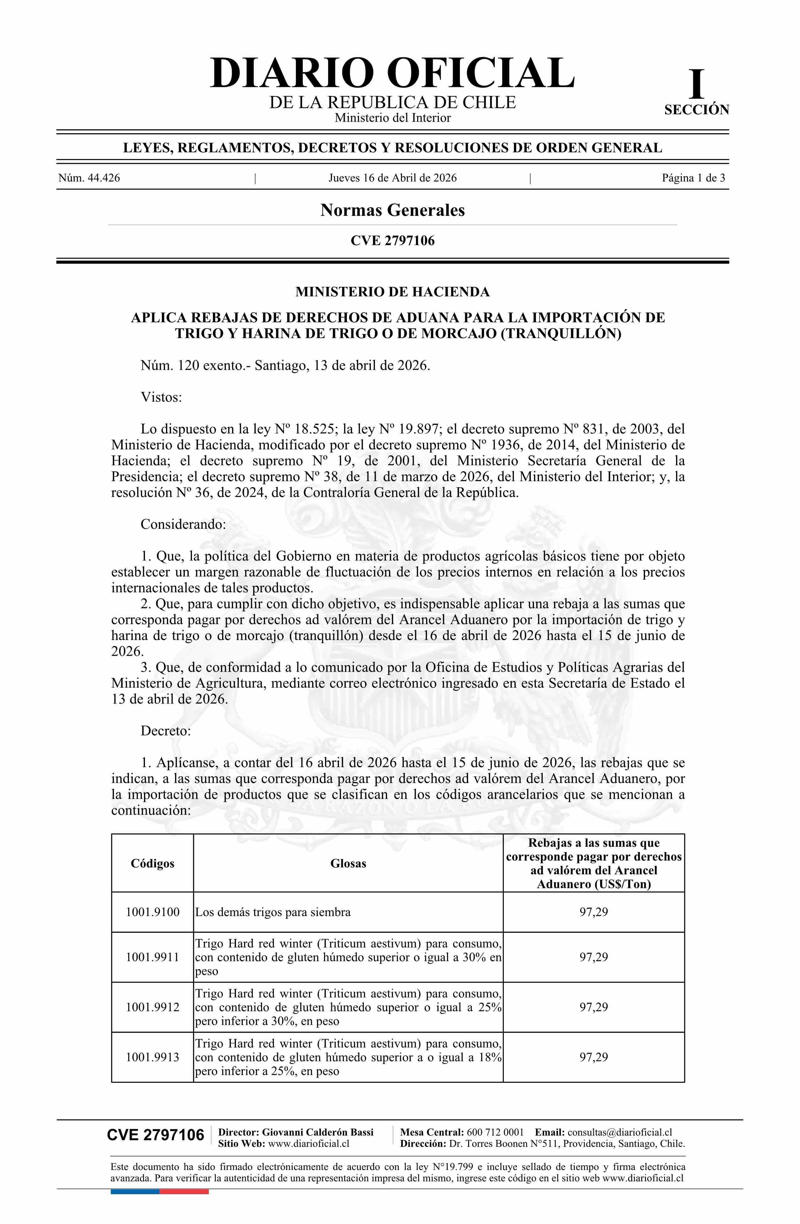 | Título: | Decreto exento número 120, de 2026.- Aplica rebajas de derechos de aduana para la importación de trigo y harina de trigo o de morcajo (tranquillón) |