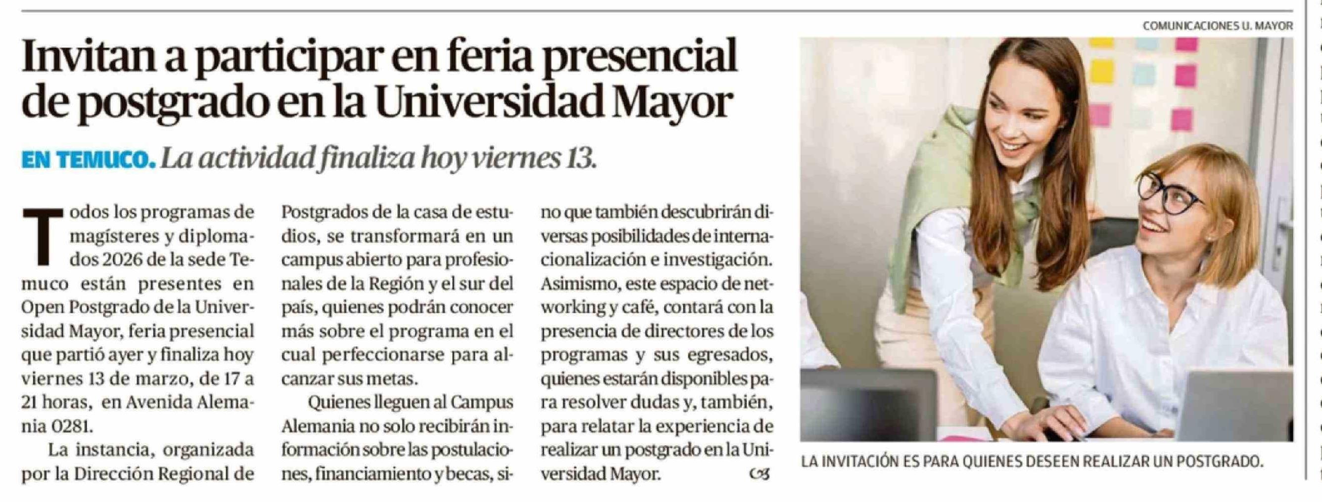 Invitan a participar en feria presencial de postgrado en la Universidad Mayor