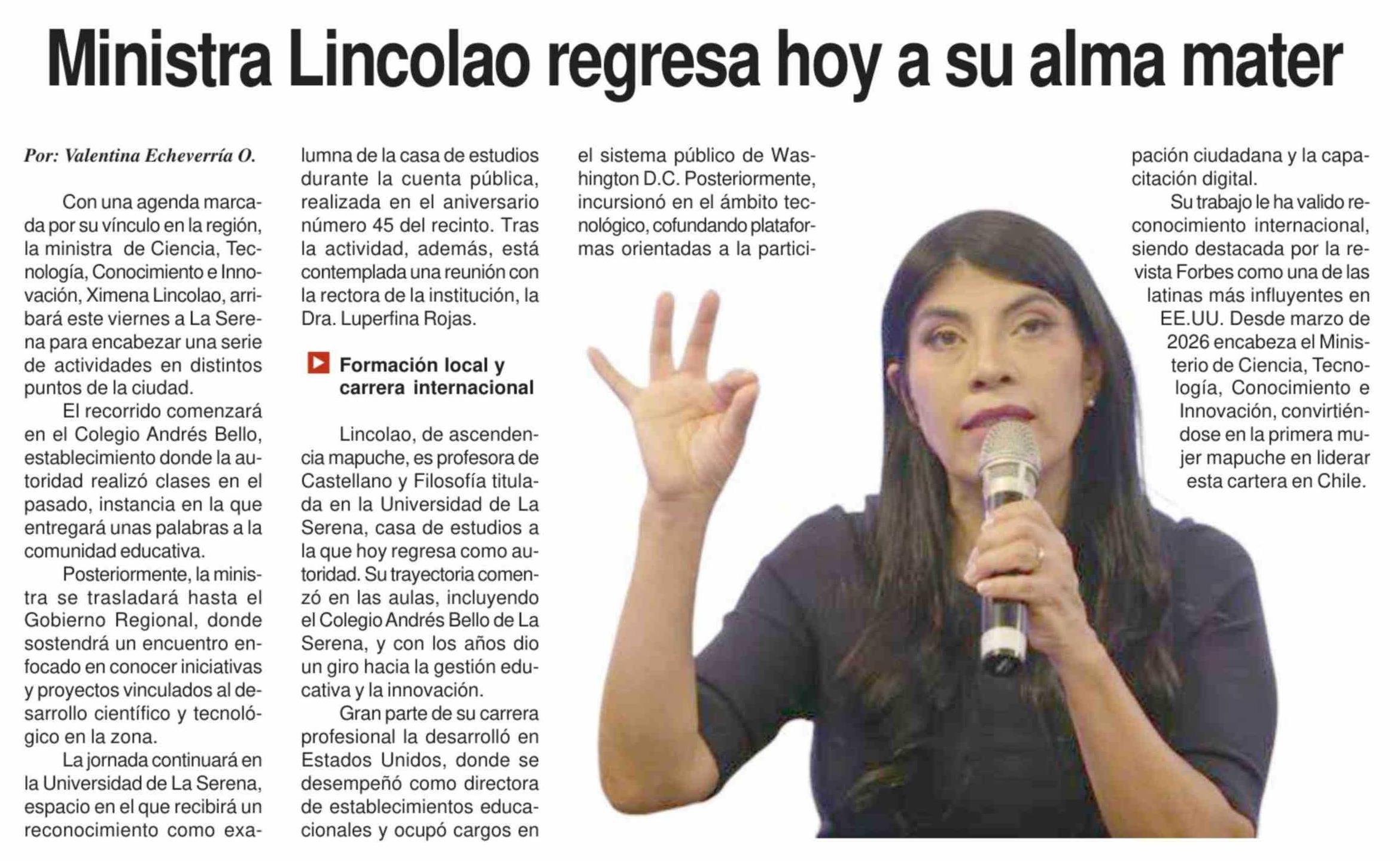 Ministra Lincolao regresa hoy a su alma mater