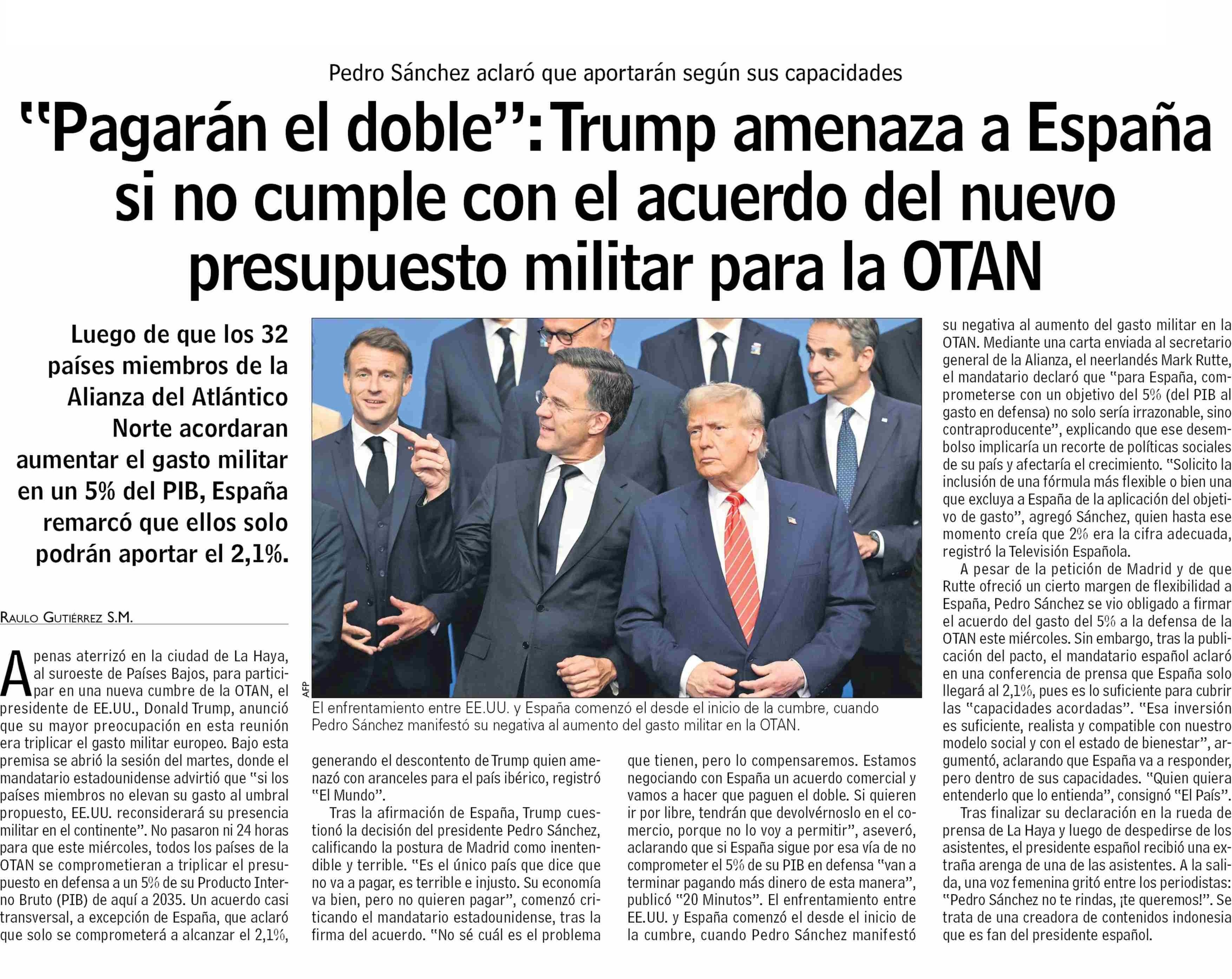 “Pagarán el doble”: Trump amenaza a España si no cumple con el acuerdo del nuevo presupuesto militar para la OTAN
