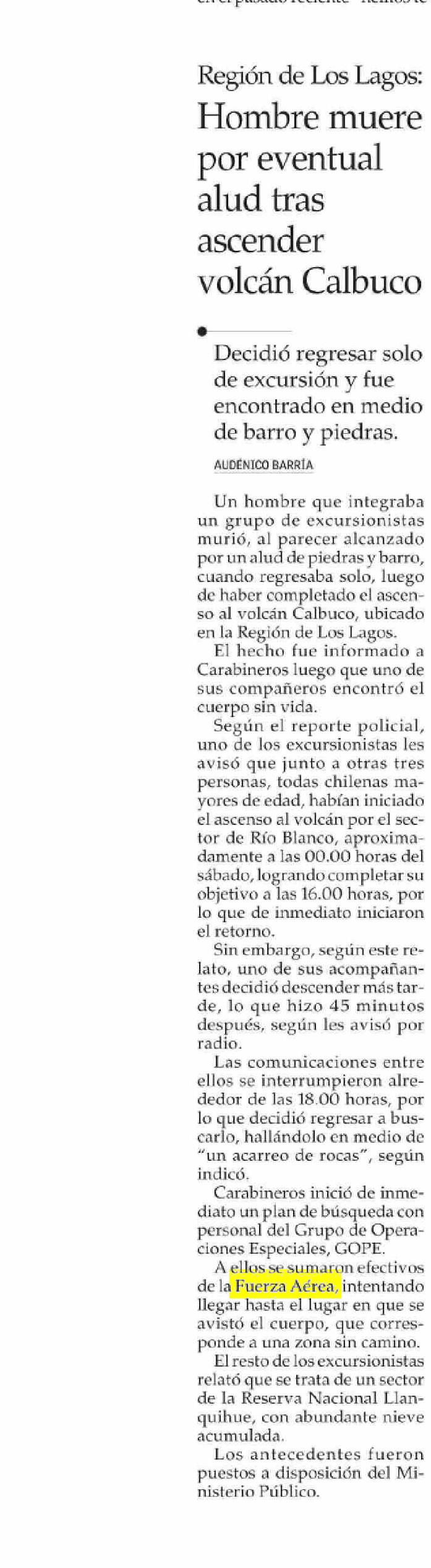 Hombre muere por eventual alud tras ascender volcán Calbuco