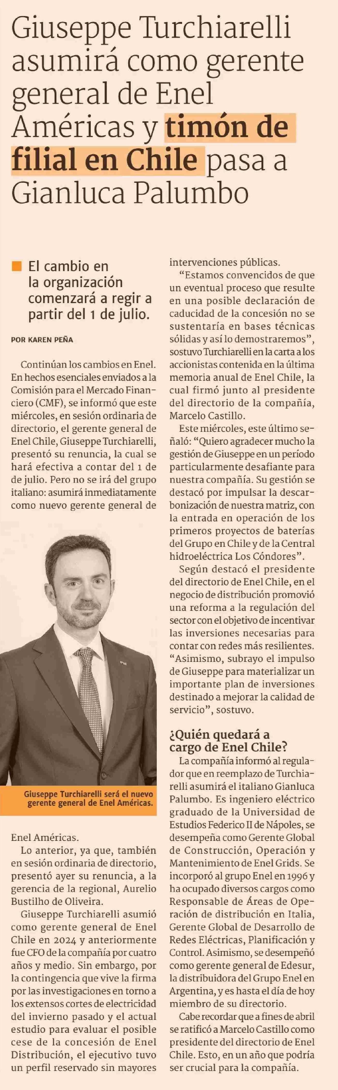 Giuseppe Turchiarelli asumirá como gerente general de Enel Américas y timón de filial en Chile pasa a Gianluca Palumbo