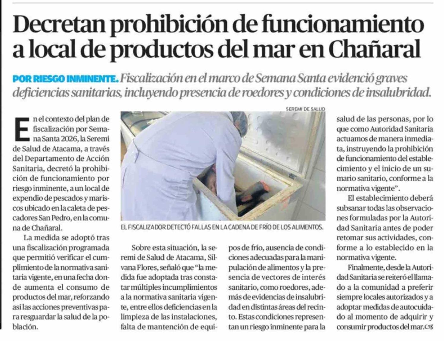 Decretan prohibición de funcionamiento a local de productos del mar en Chañaral