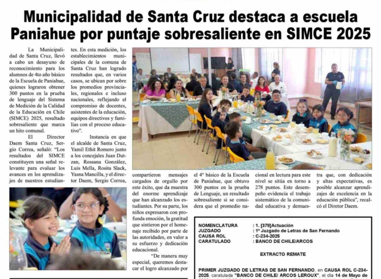 Municipalidad de Santa Cruz destaca a escuela Paniahue por puntaje sobresaliente en SIMCE 2025