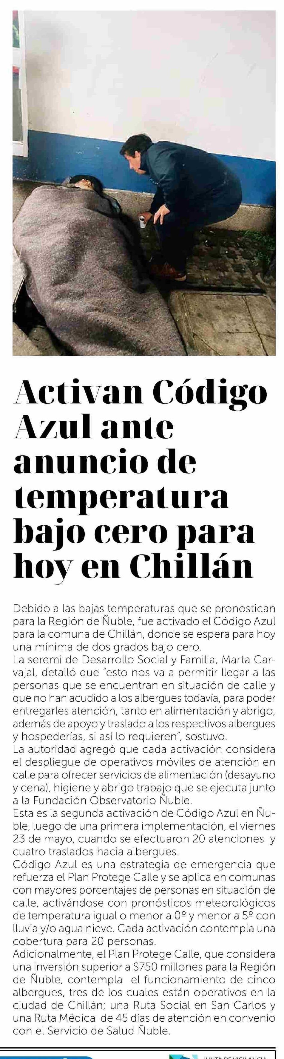 Activan Código Azul ante anuncio de temperatura bajo cero para hoy en Chillán