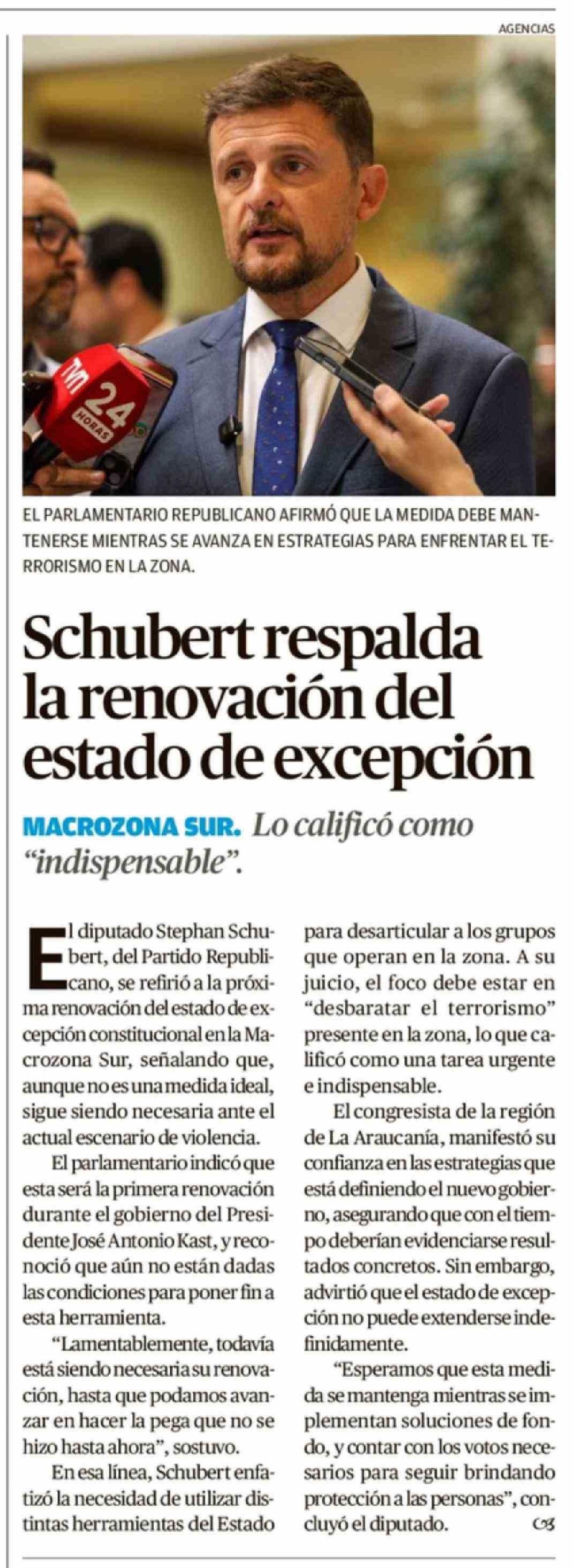 Schubert respalda la renovación del estado de excepción