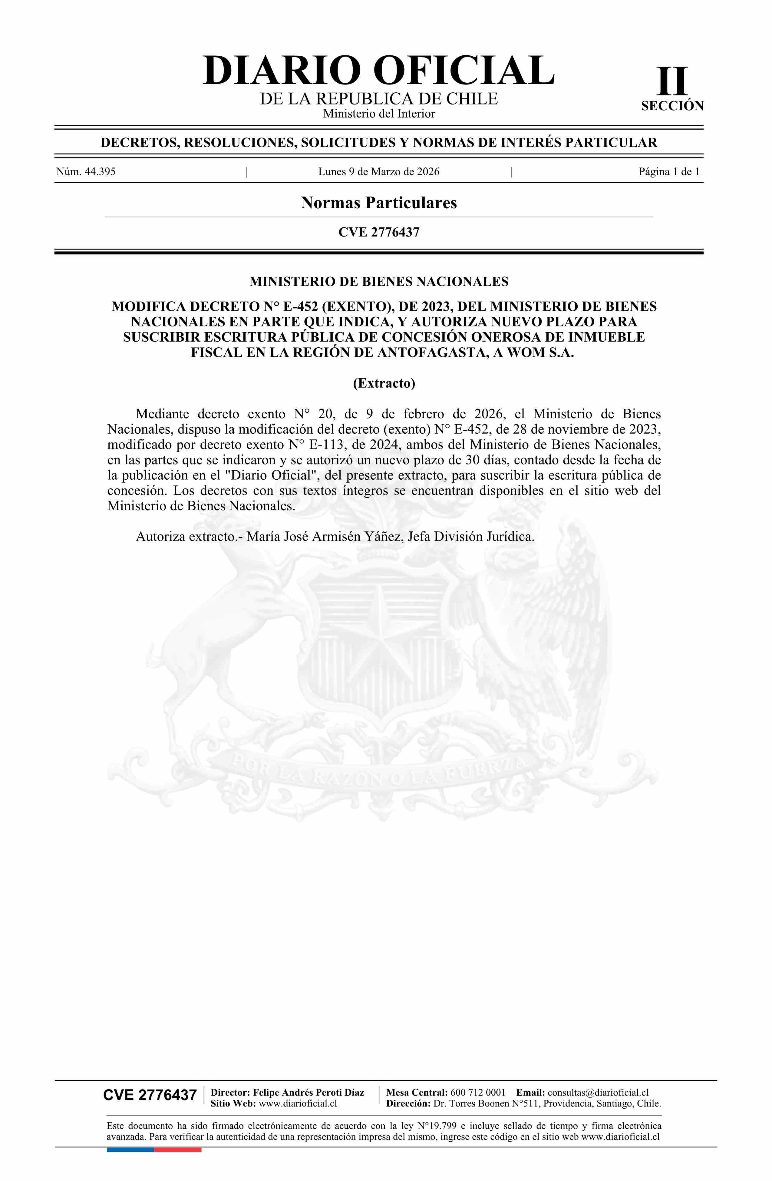 Título: Extracto de decreto exento número 20, de 2026.- Modifica decreto N° E-452 exento, de 2023, en parte que indica, y autoriza nuevo plazo para suscribir escritura pública de concesión onerosa de inmueble fiscal en la Región de Antofagasta, a Wom S.A.