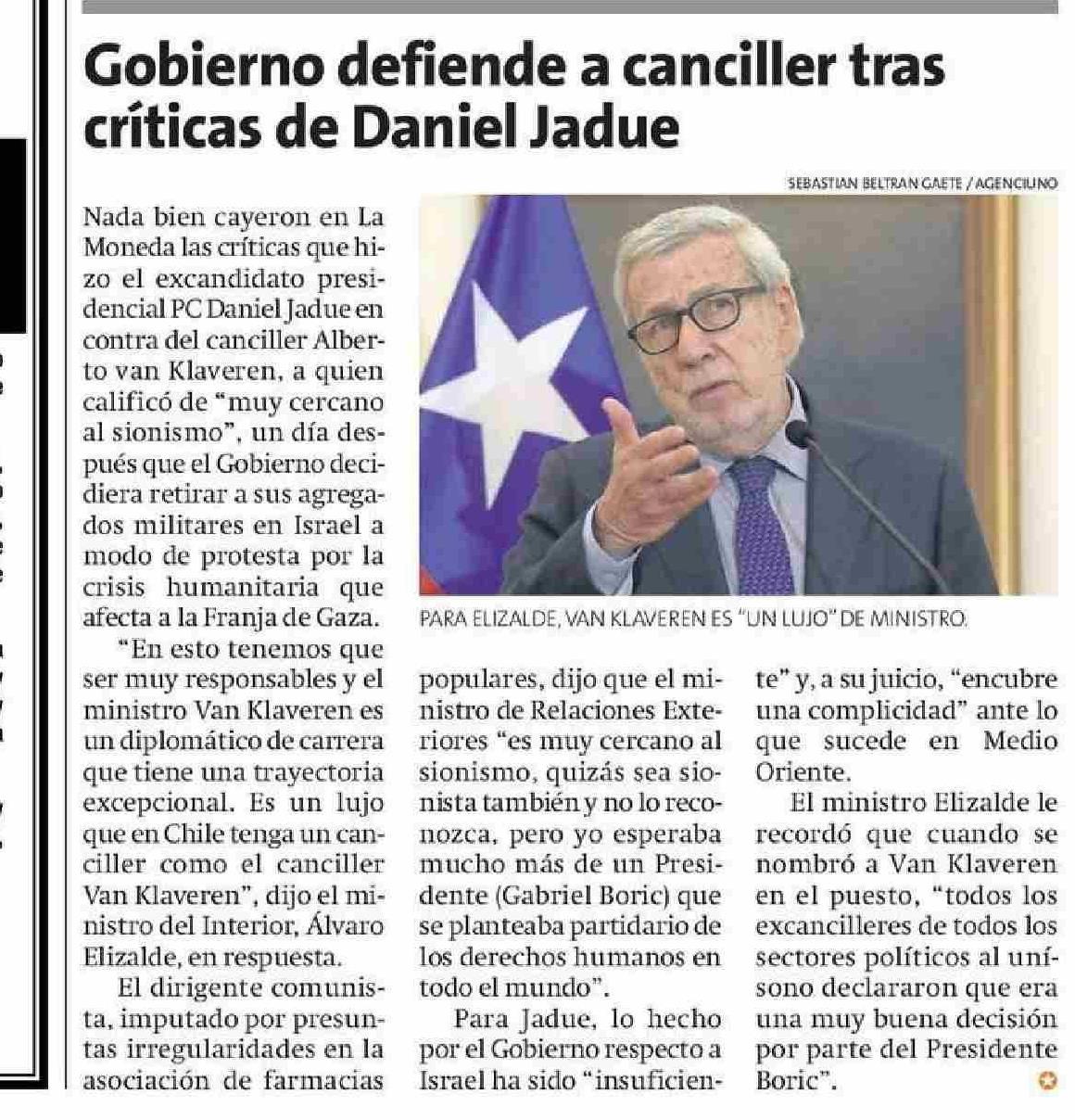 Gobierno defiende a canciller tras críticas de Daniel Jadue
