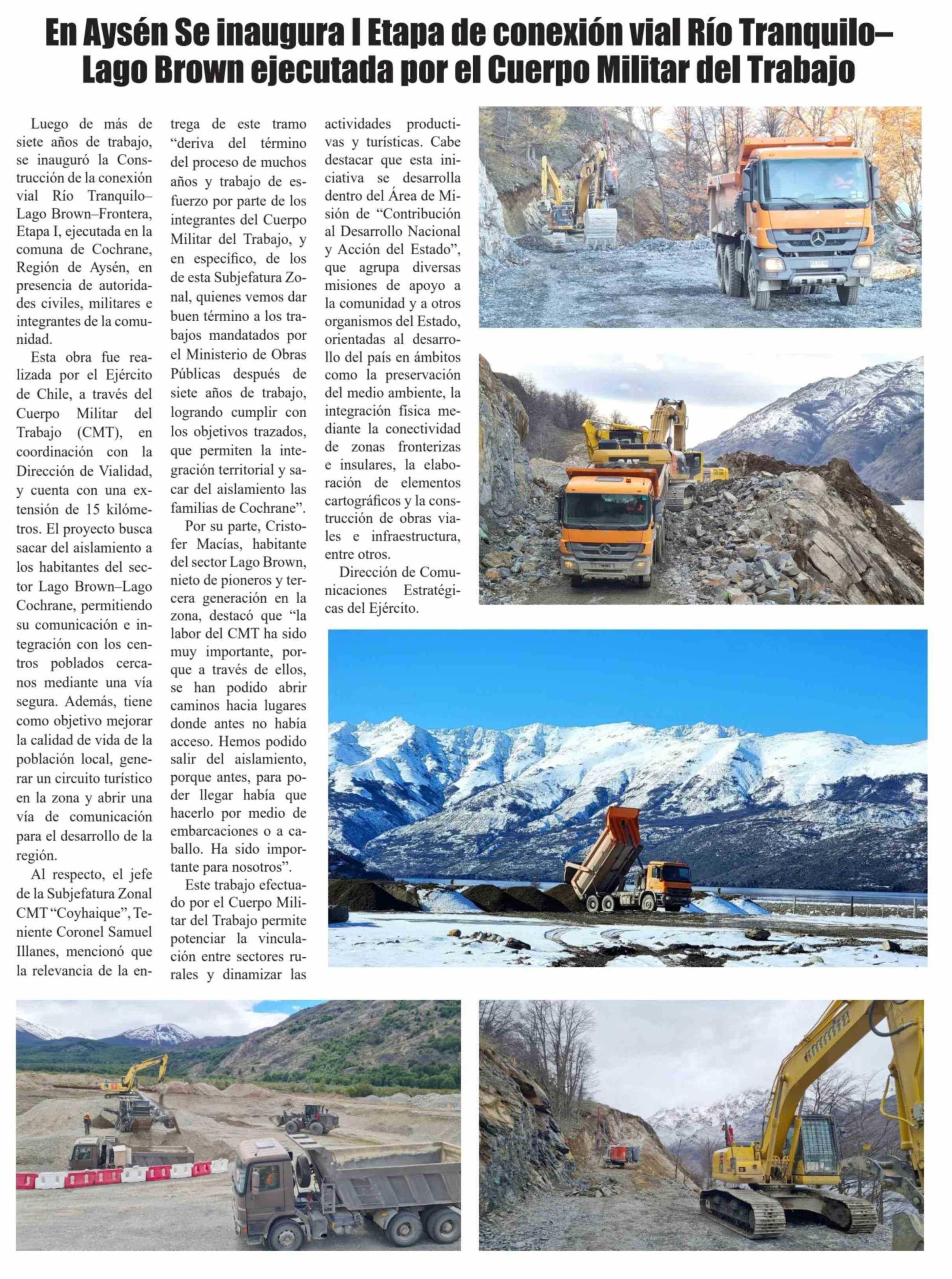 En Aysén Se inaugura I Etapa de conexión vial Río TranquiloLago Brown ejecutada por el Cuerpo Militar del Trabajo