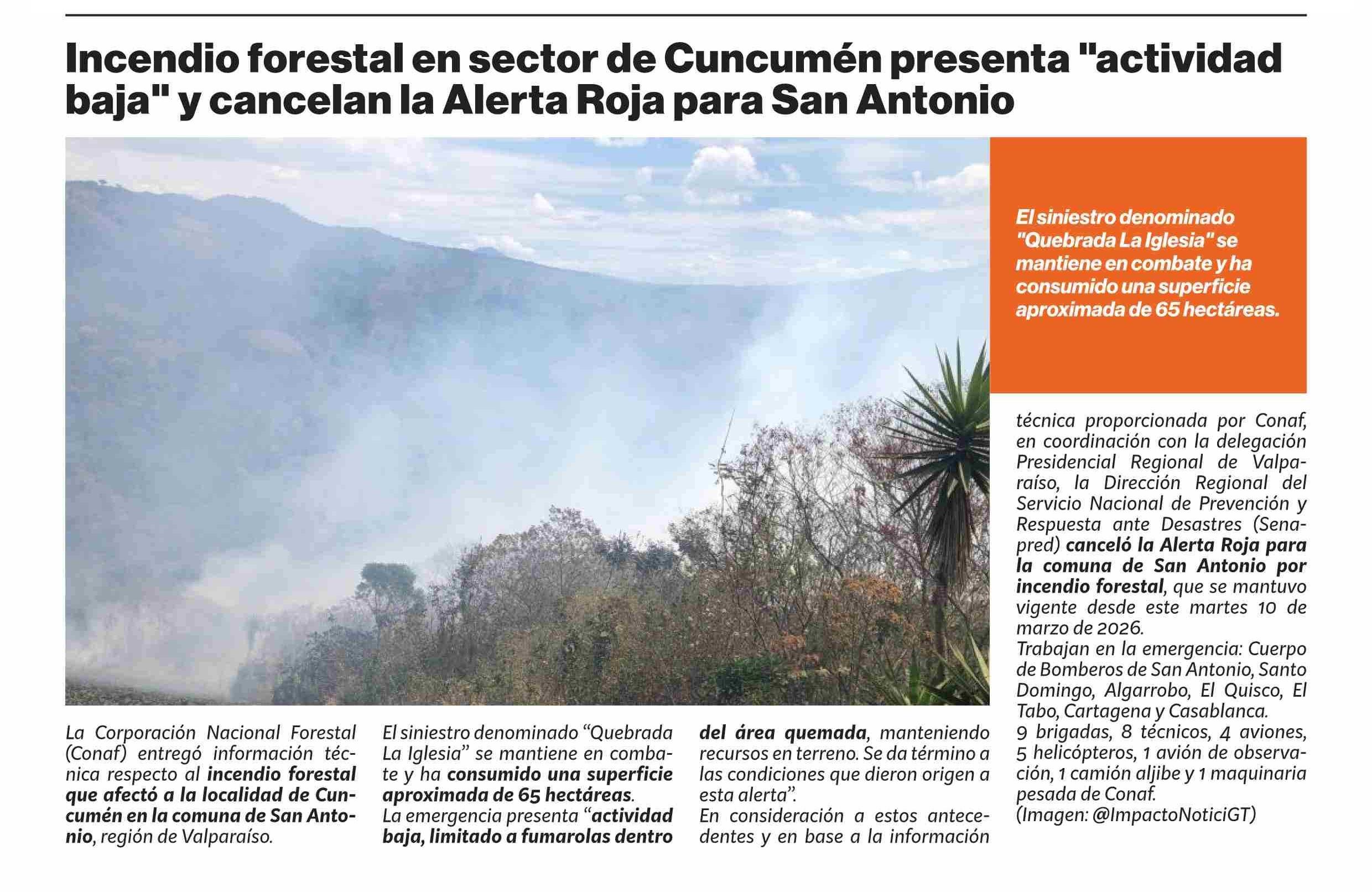 Título: Incendio forestal en sector de Cuncumén presenta “actividad baja” y cancelan la Alerta Roja para San Antonio