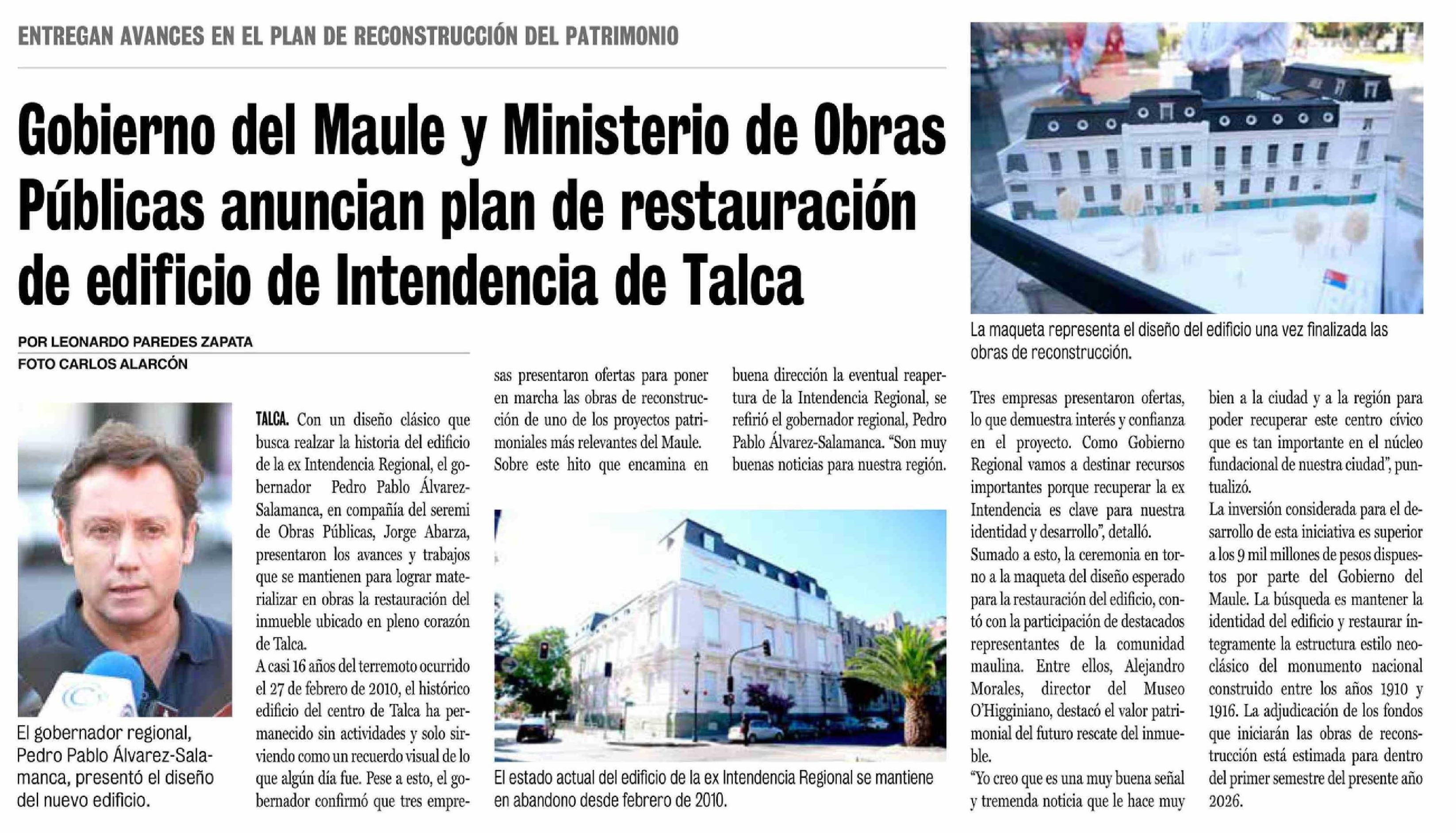 Gobierno del Maule y Ministerio de Obras Públicas anuncian plan de restauración de edificio de Intendencia de Talca