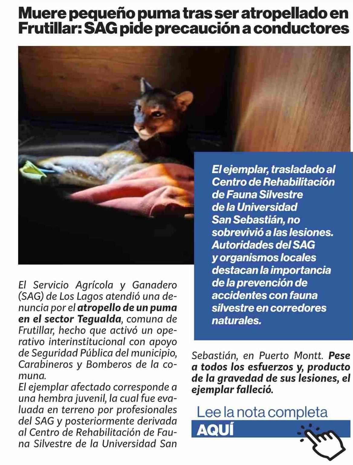 Muere pequeño puma tras ser atropellado en Frutillar: SAG pido: precaución a conductores
