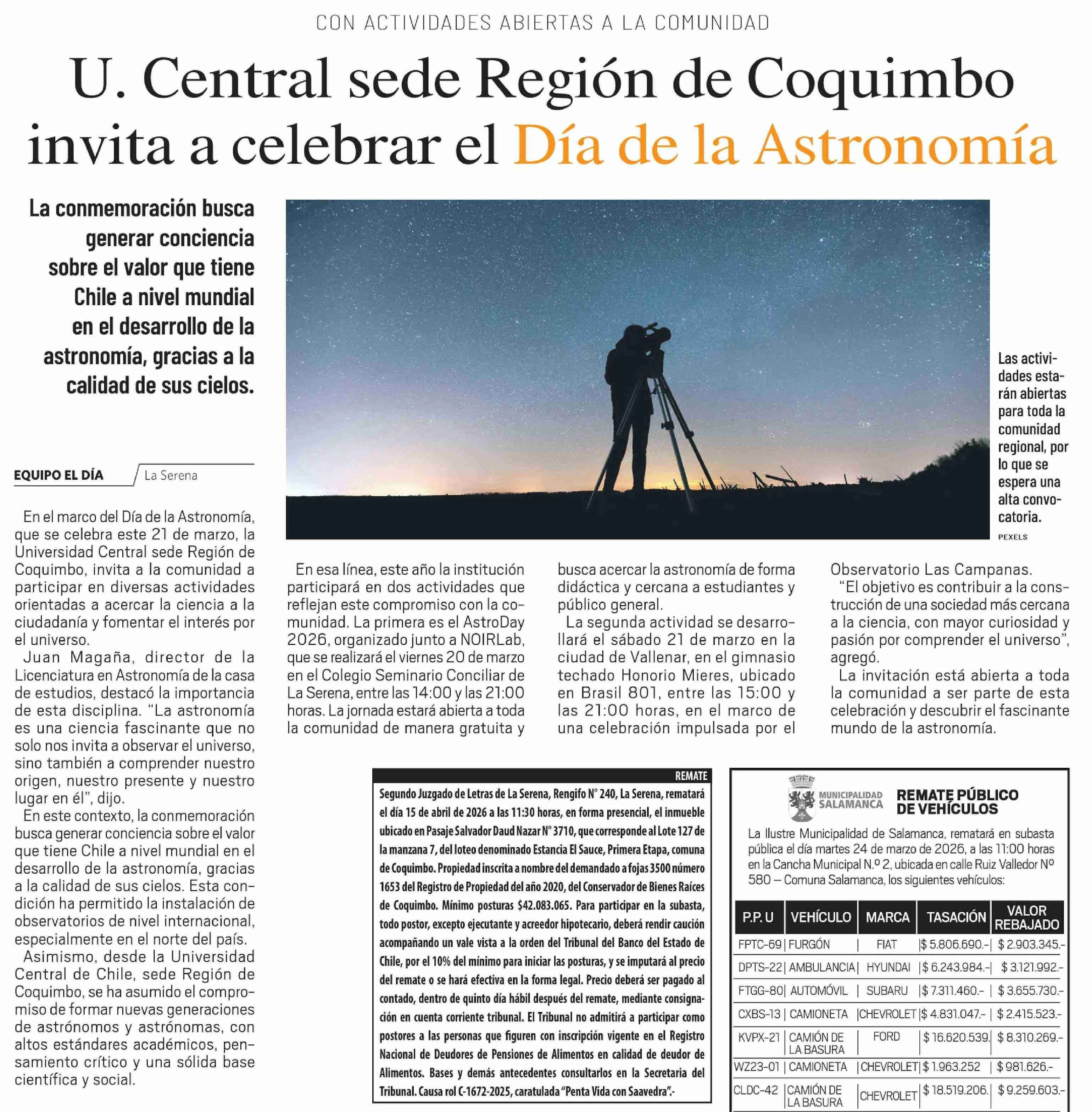 U. Central sede Región de Coquimbo invita a celebrar el Día de la Astronomía