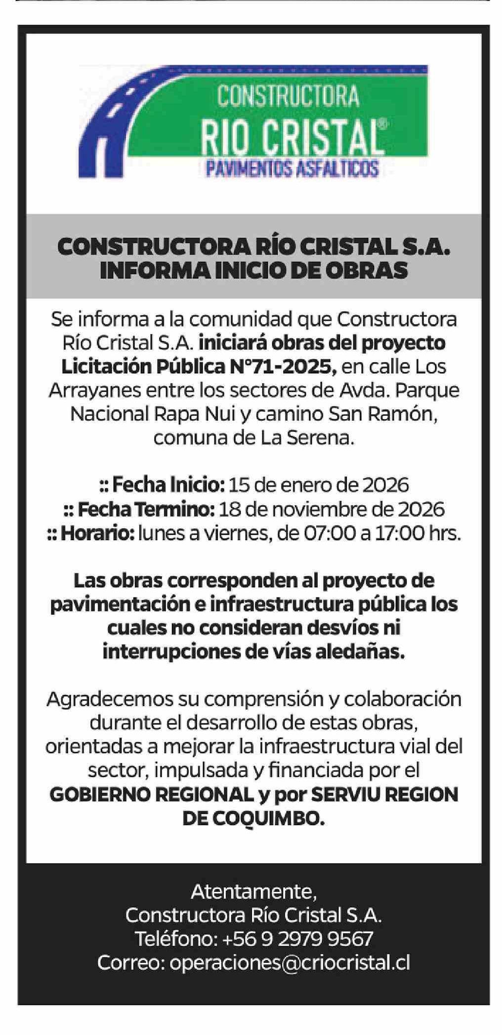 Extractos: CONSTRUCTORA RÍO CRISTAL S.A. INFORMA INICIO DE OBRAS