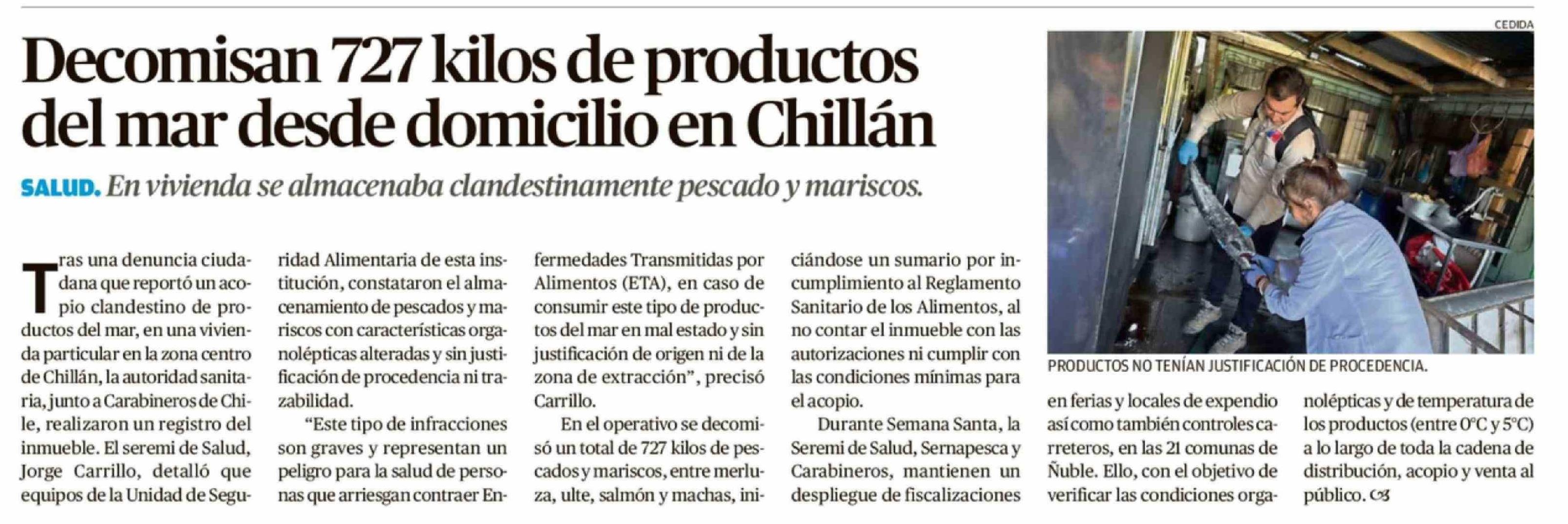 Decomisan 727 kilos de productos del mar desde domicilio en Chillán
