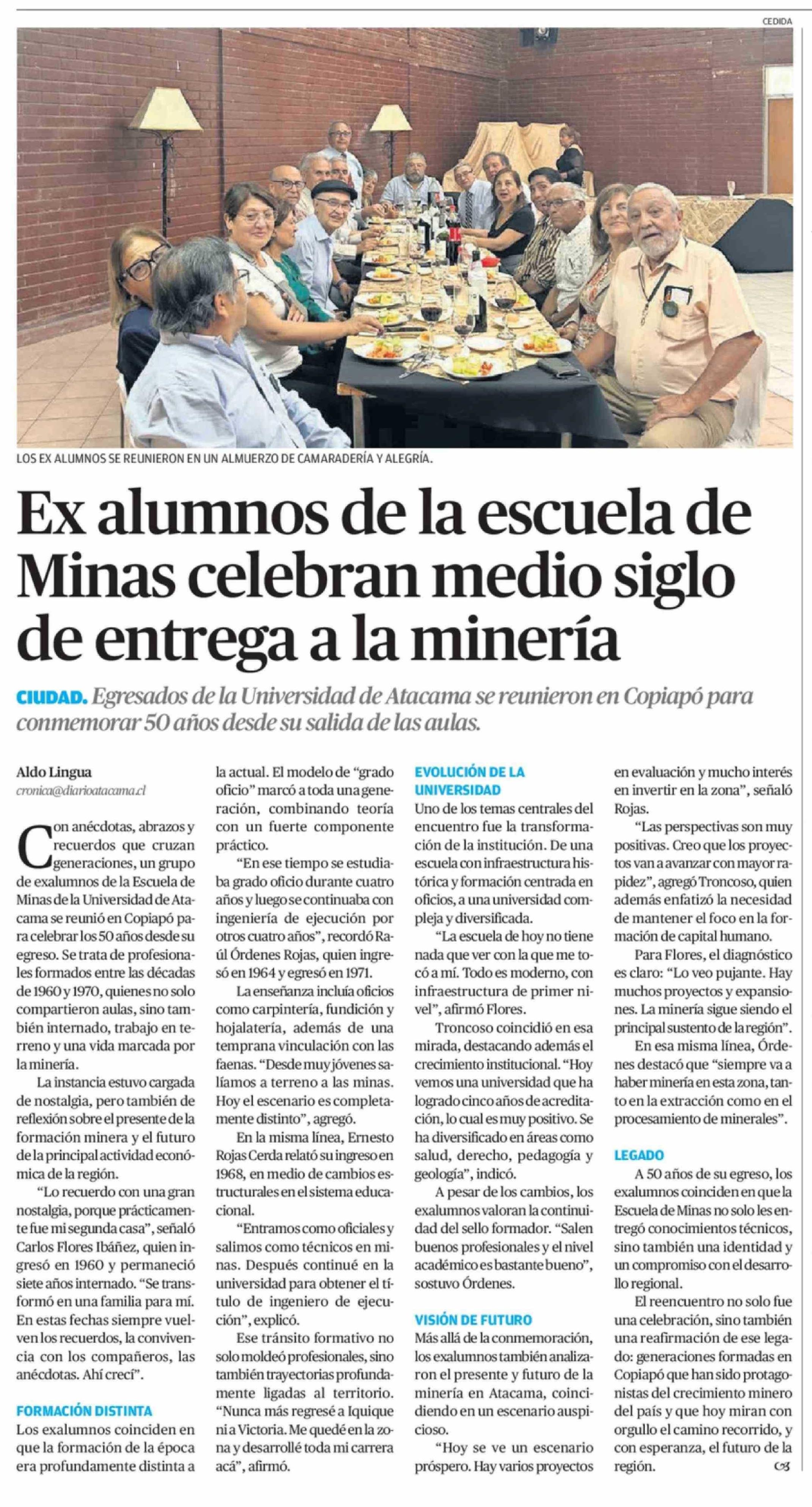 Ex alumnos de la escuela de Minas celebran medio siglo de entrega a la minería