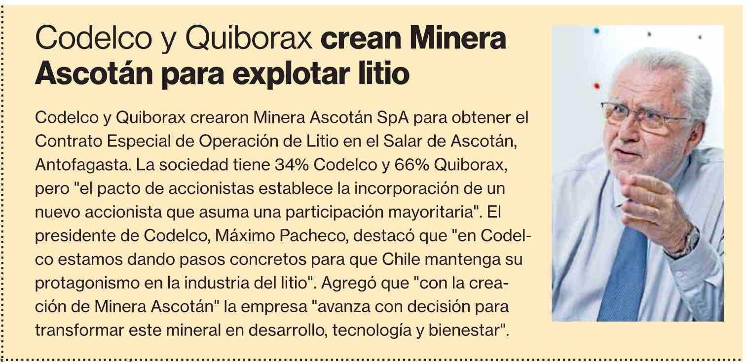 Codelco y Quiborax crean Minera Ascotán para explotar litio