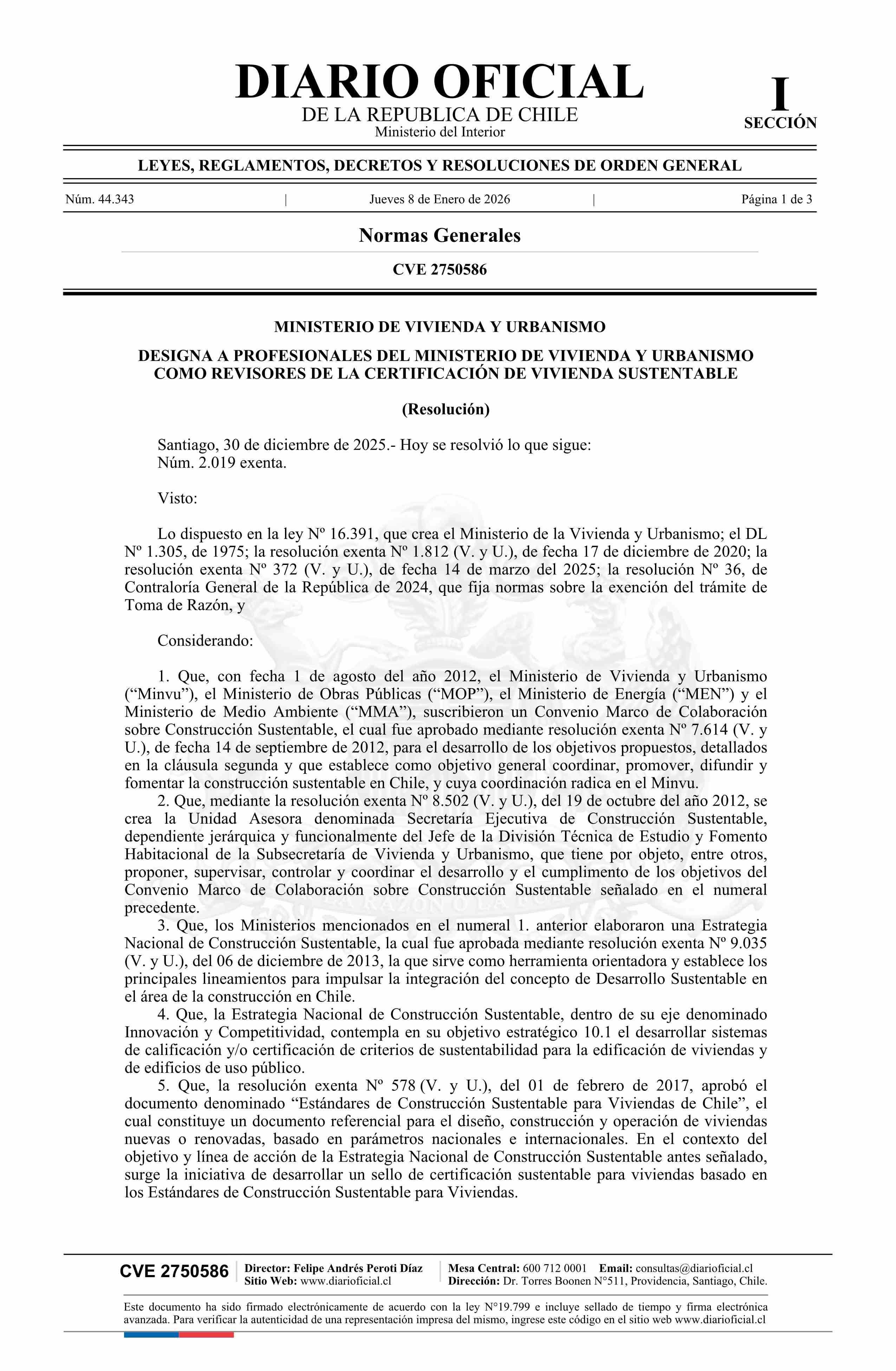 | Título: | Resolución exenta número 2.019, de 2025.- Designa a profesionales como Revisores de la Certificación de Vivienda Sustentable |