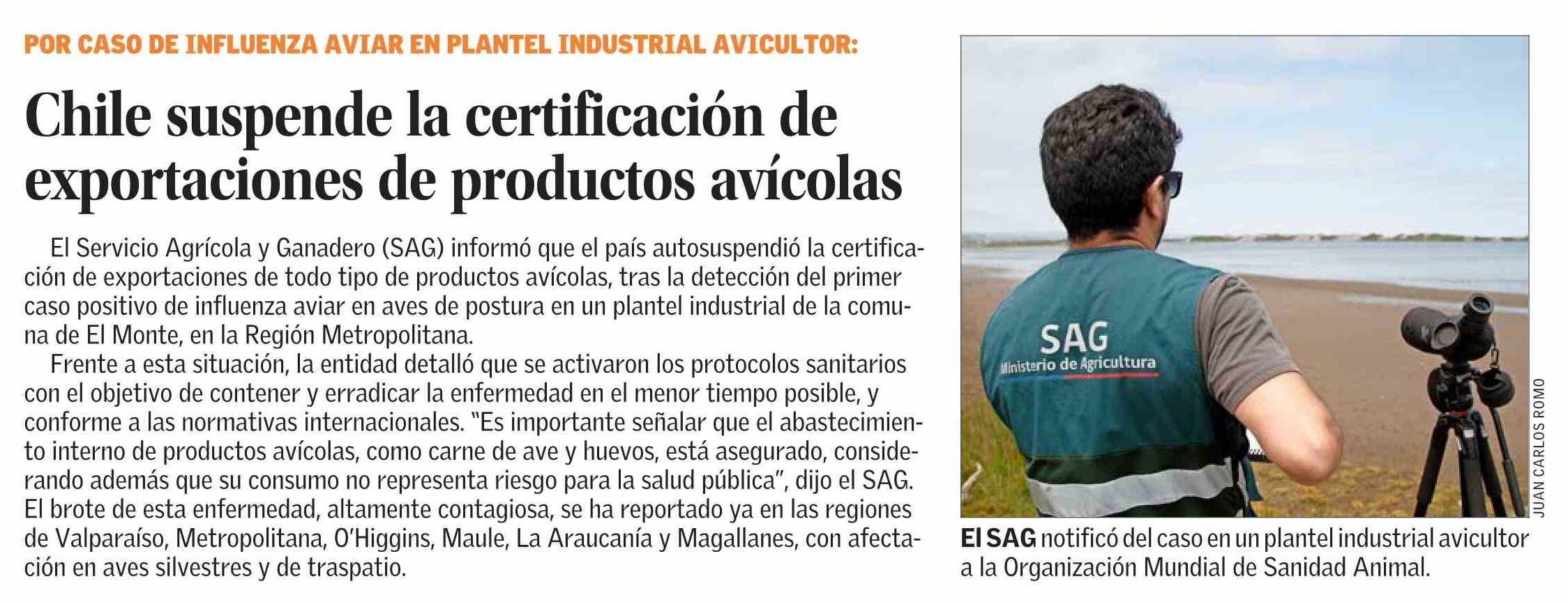 Chile suspende la certificación de exportaciones de productos avícolas