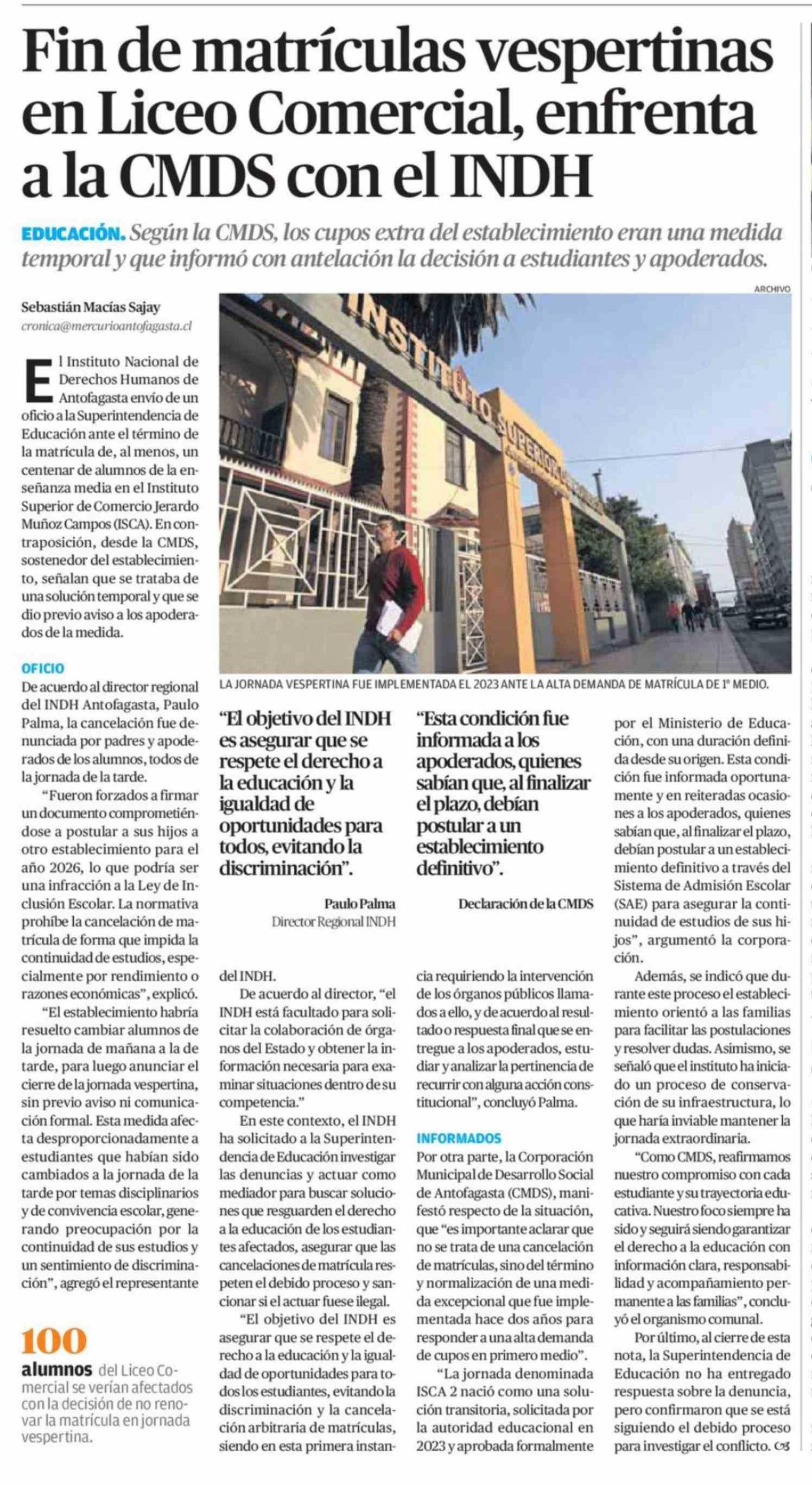 Fin de matrículas vespertinas en Liceo Comercial, enfrenta a la CMDS con el INDH