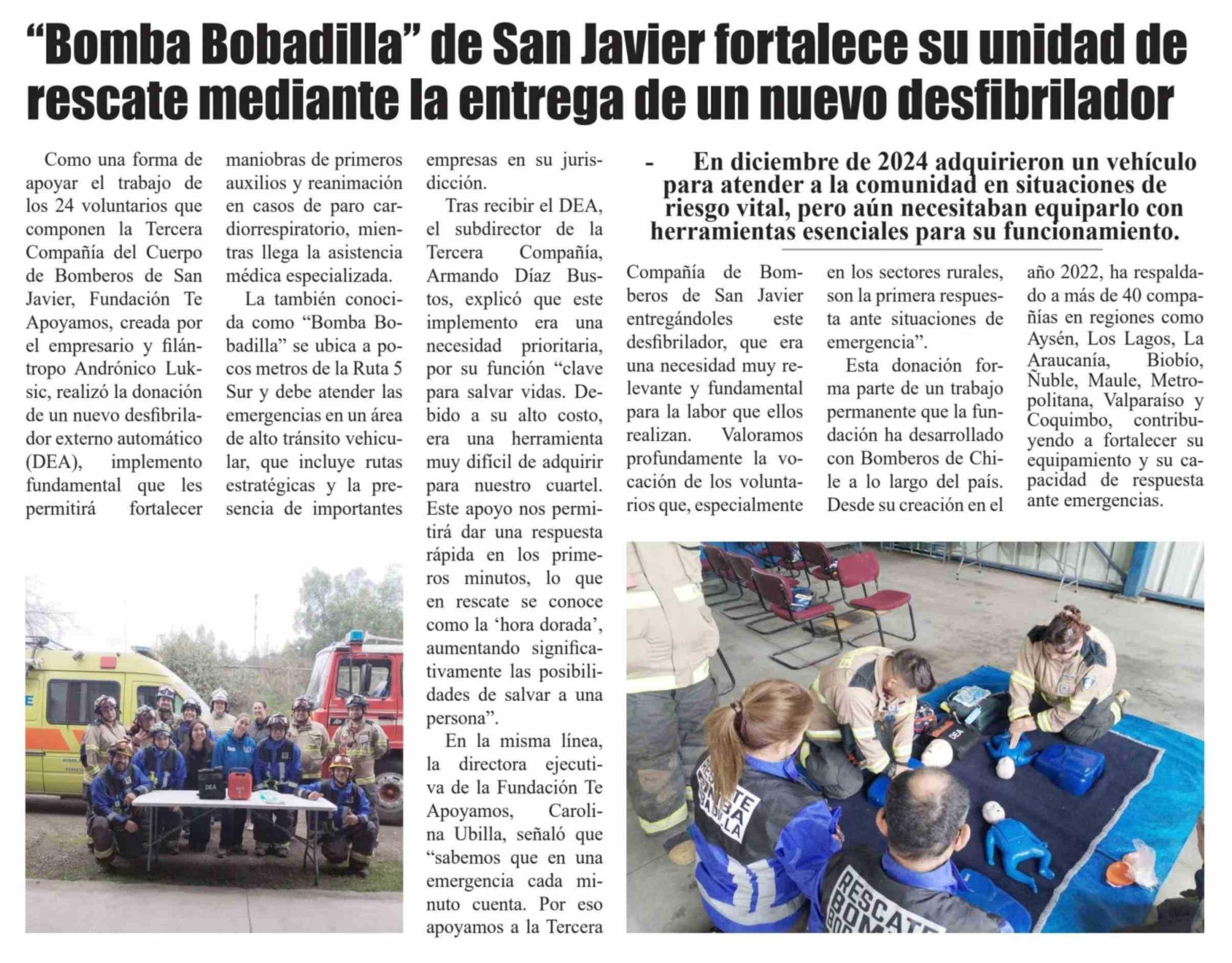 "Bomba Bobadilla" de San Javier fortalece su unidad de rescate mediante la entrega de un nuevo desfibrilador