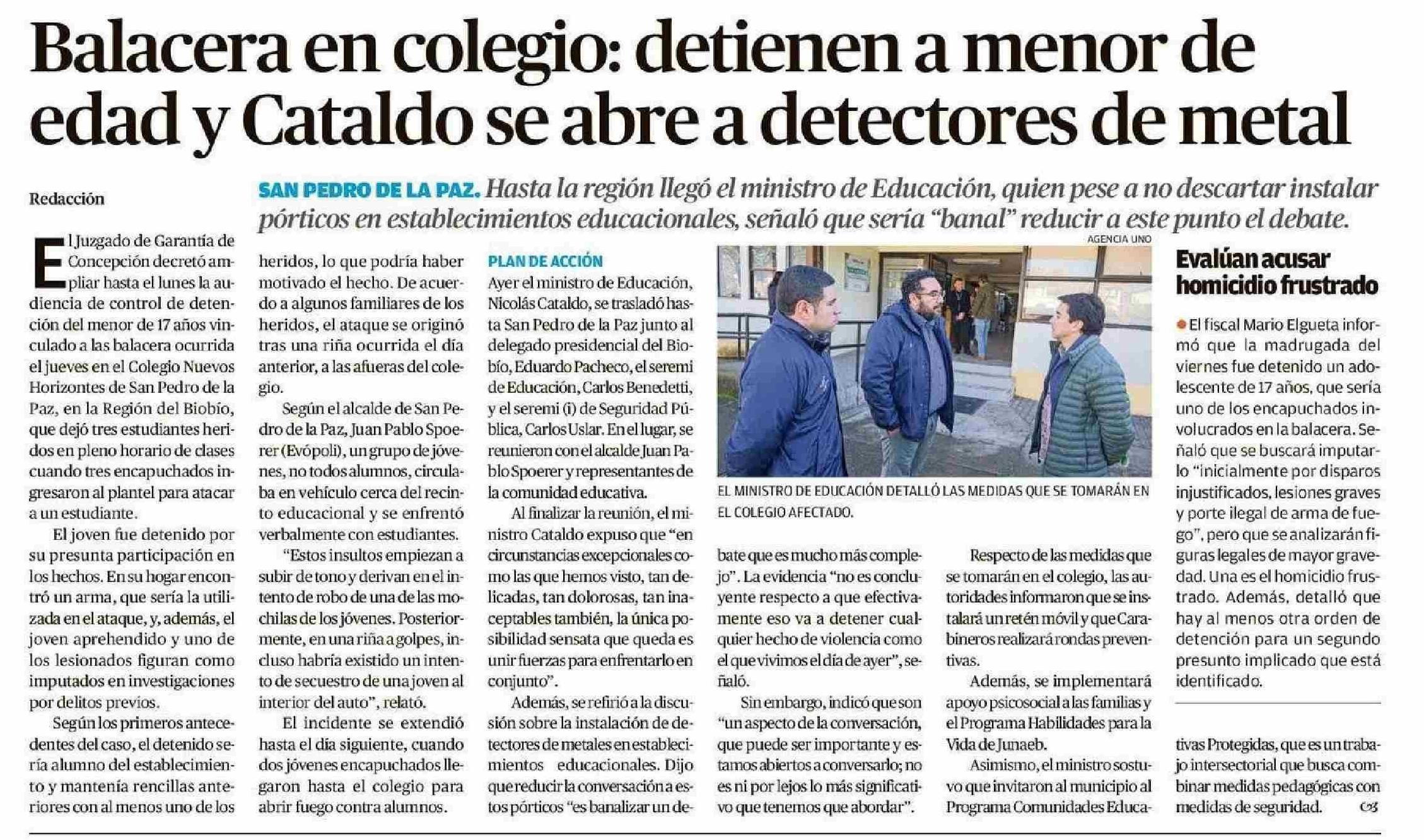 Balacera en colegio: detienen a menor de edad y Cataldo se abre a detectores de metal