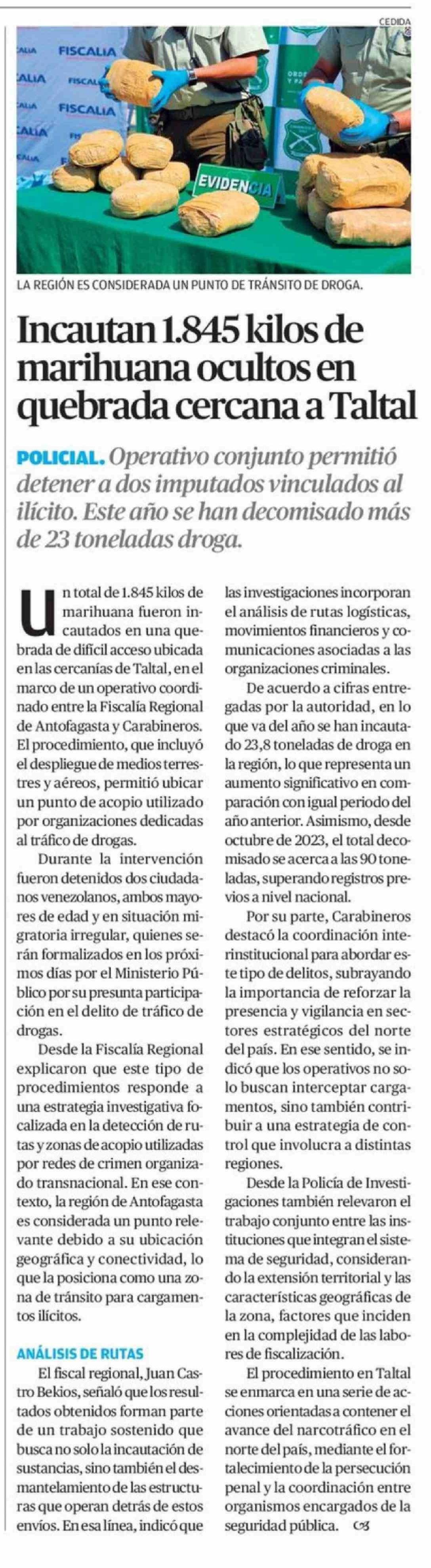 Incautan 1.845 kilos de marihuana ocultos en quebrada cercana a Taltal