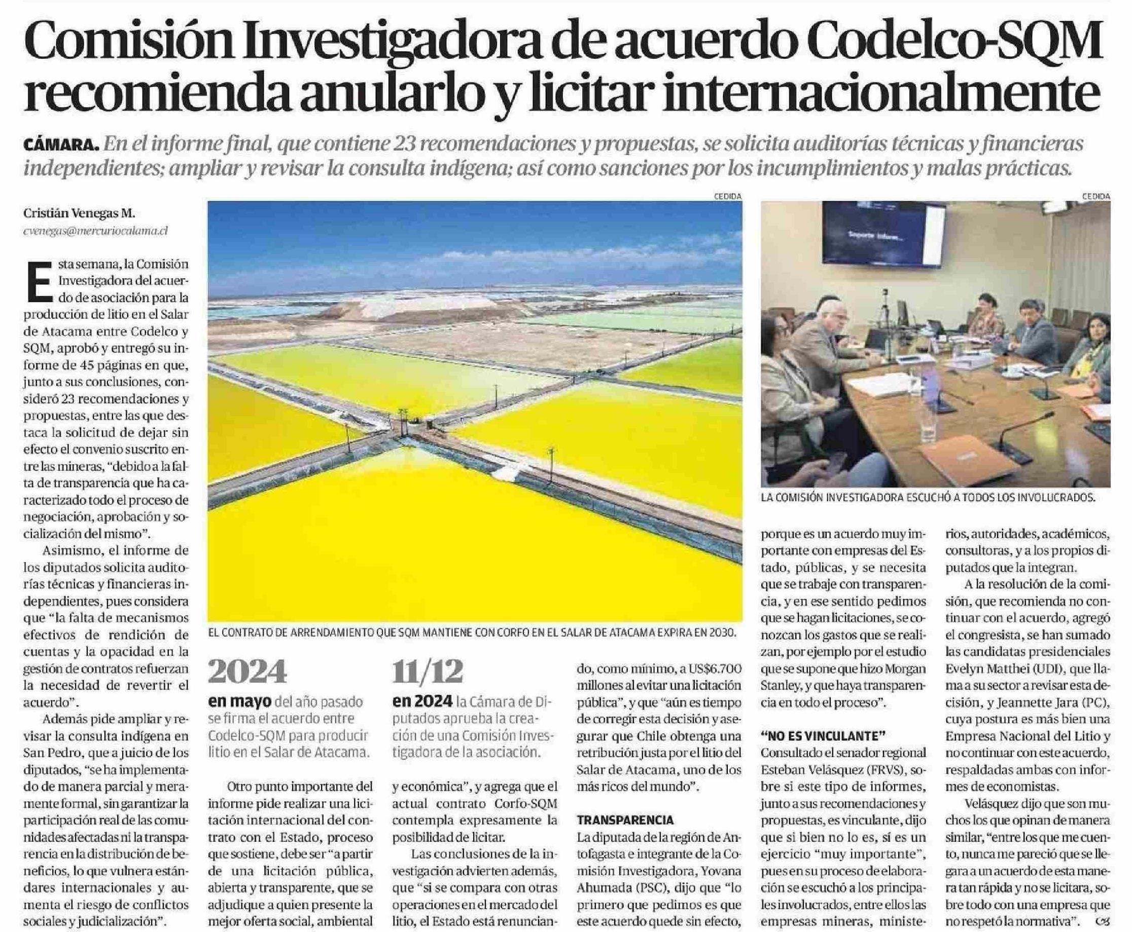Comisión Investigadora de acuerdo Codelco-SQM recomienda anularlo y licitar internacionalmente